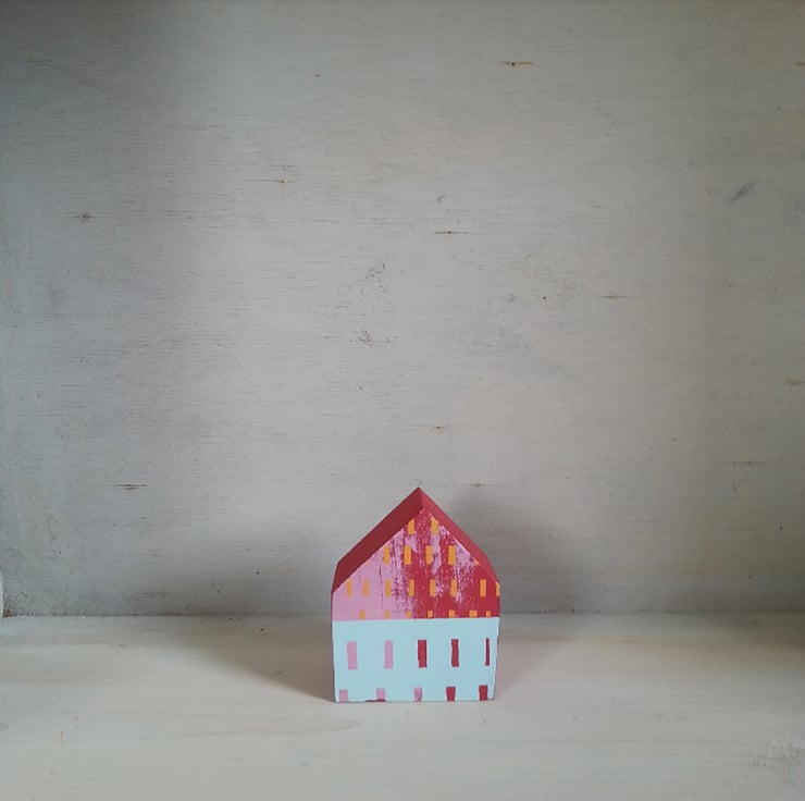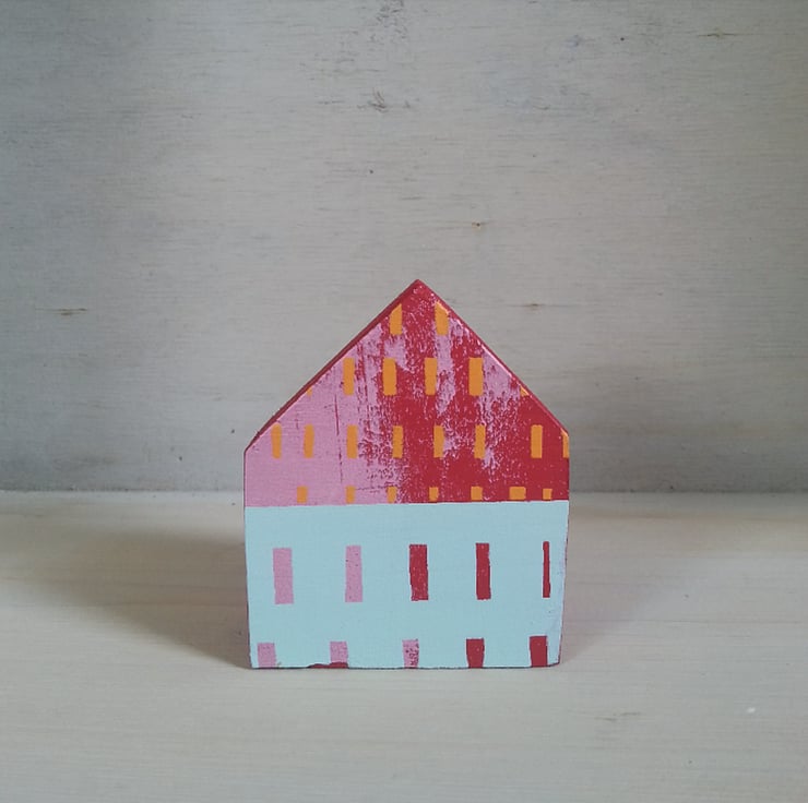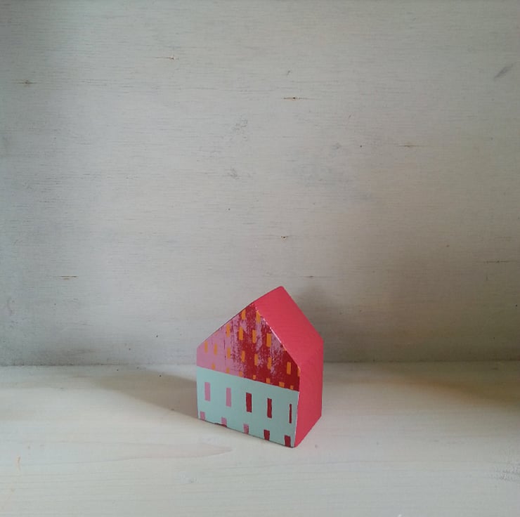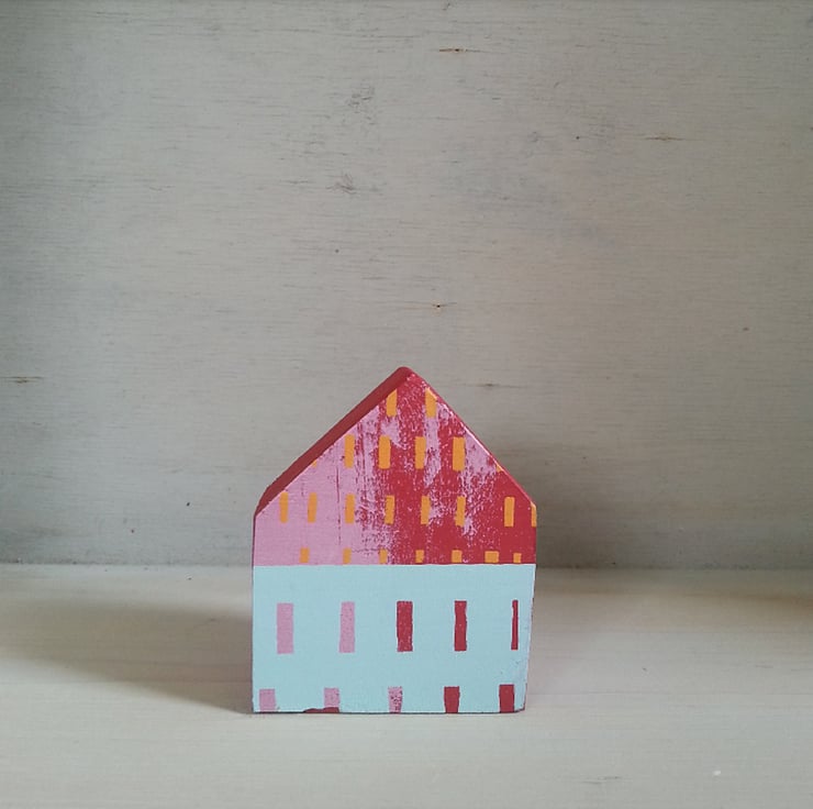 This one of a kind little wooden house is made from reclaimed wood, painted bright red, and screen-printed by hand in layers of pink, orange and duck egg blue. The back of the house is blank.