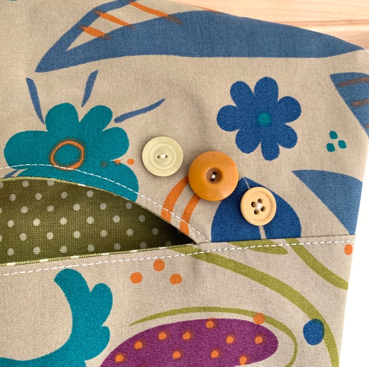 Brighten up your washing line with this pretty peg bag in Gudrun Sjoden cotton, featuring colourful birds and flowers, fully lined in spotty cotton and trimmed with 3 old buttons.