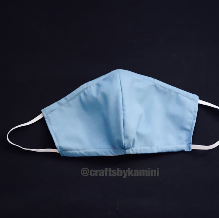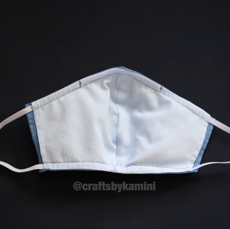 This face covering is made from blue fabric (sllightly darker than photo), with a lighter blue back.