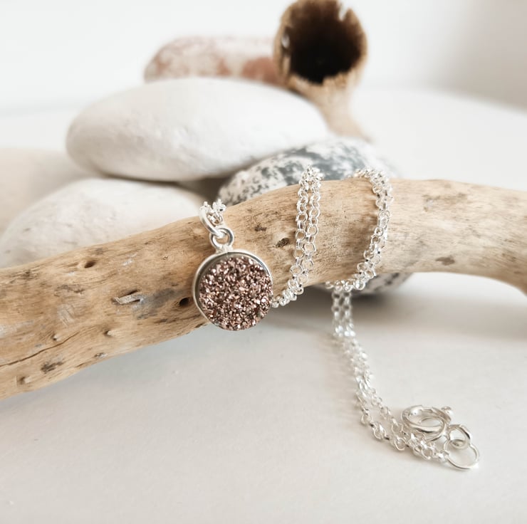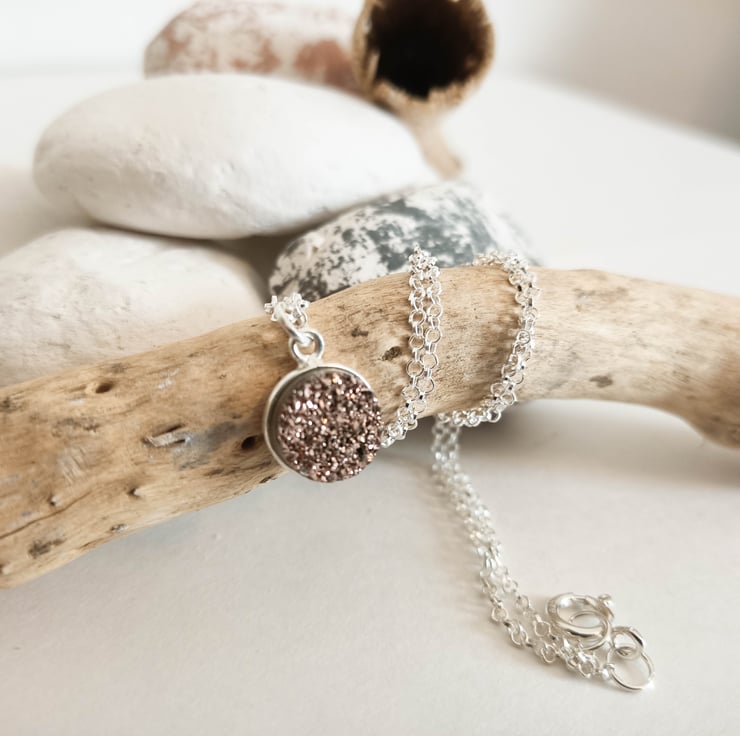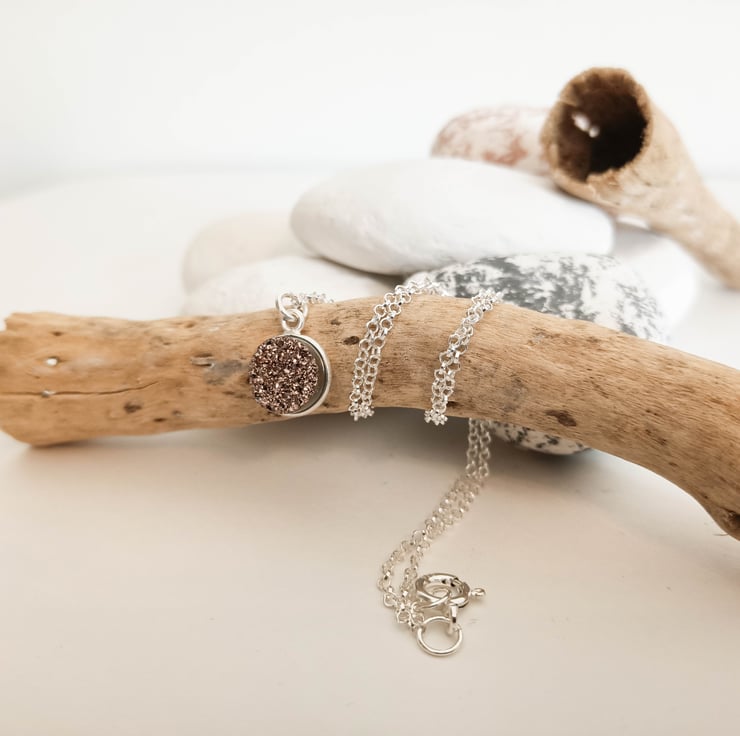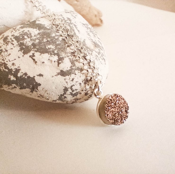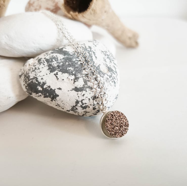 Sterling Silver Copper Druzy Round Pendant on Sterling Silver Necklace. Druzy is a natural surface layer of glittery crystals, formed on top of another stone (most commonly agate).