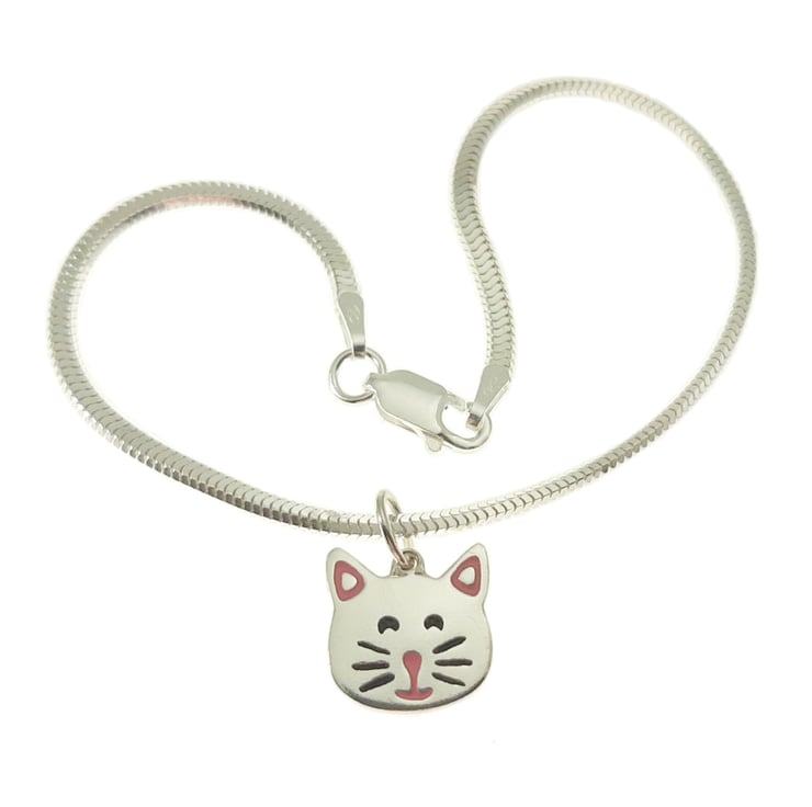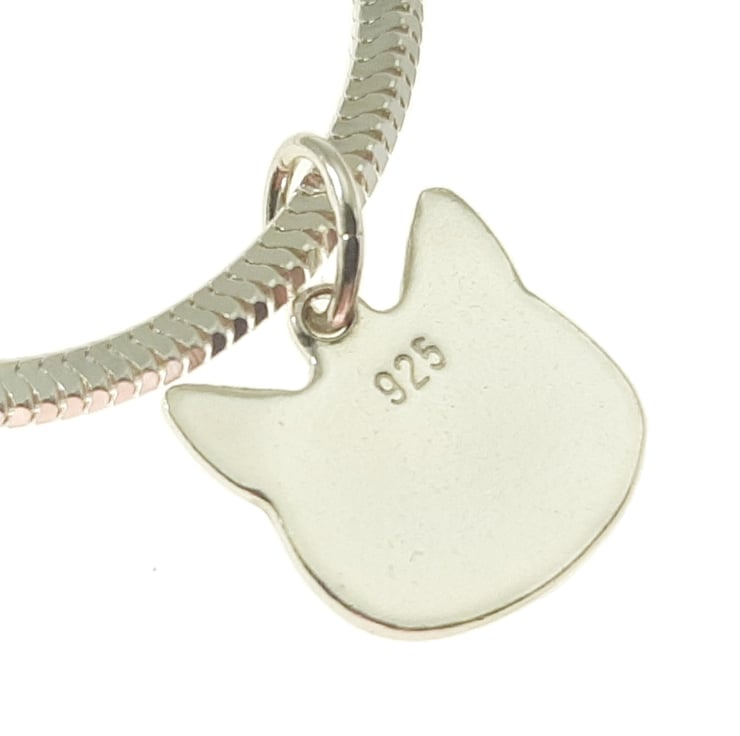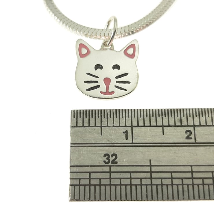 This cat bracelet has been lovingly crafted in the Shropshire. It is handmade from sterling silver sheet and is etched before being cut by hand. The edges are then smoothed using files and emery paper before it is given it's shape using a punch and hammer. A 5mm oval jump ring is then attached. Black and pink resin based enamels are added to the etched areas and the piece is then polished before being attached to a chain.