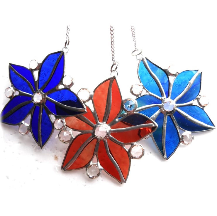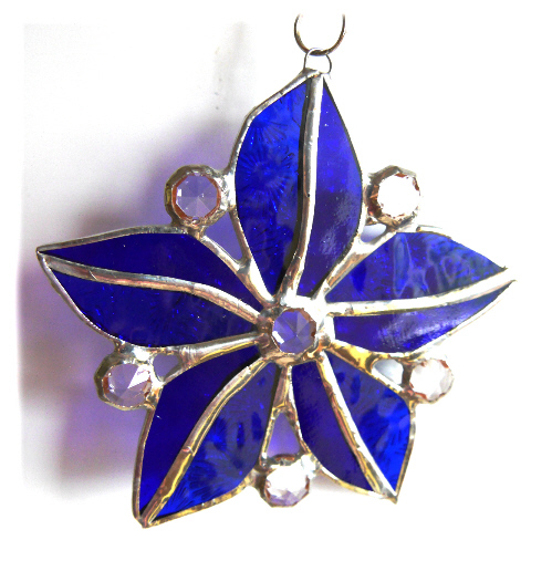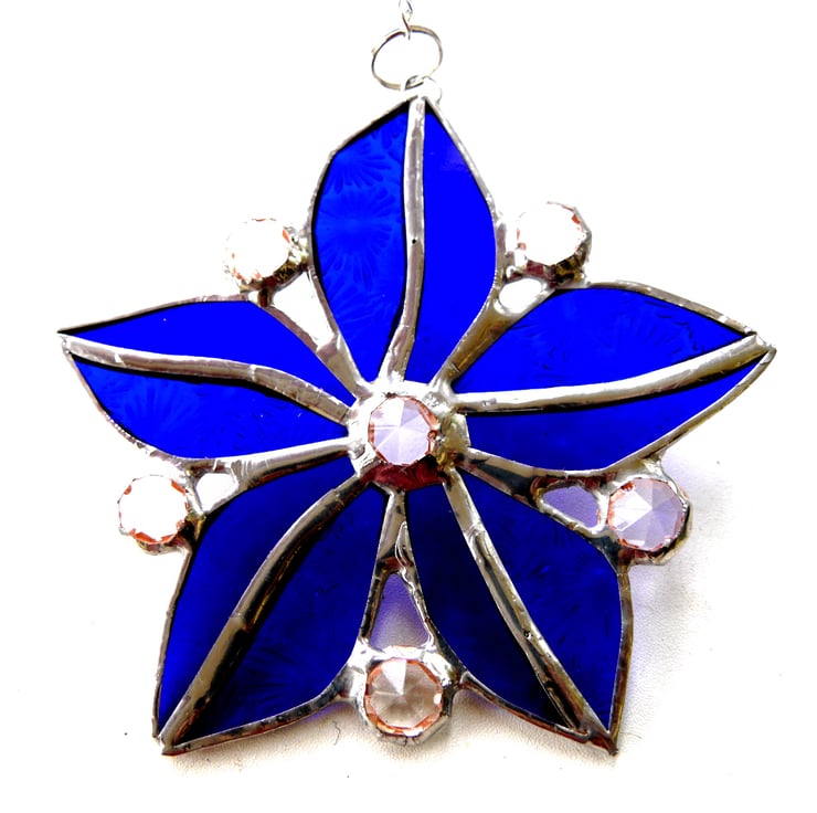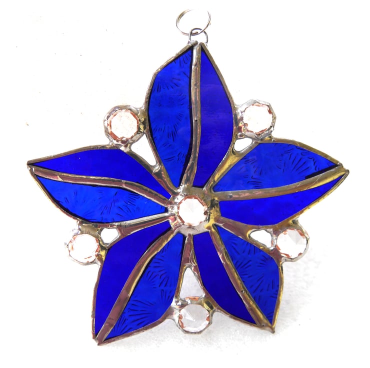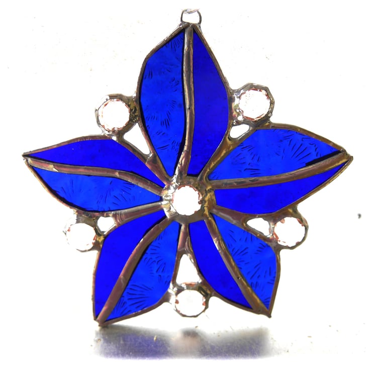It is a gorgeous star shaped 5 petal flower with each petal split into 2 using 2 types of bright blue glass. Between each petal I've soldered a multifaceted little twinkly crystal and there's one in the centre of the flower as well.