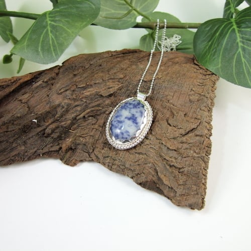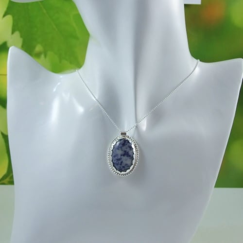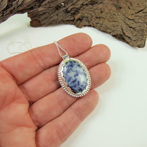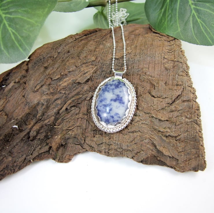 The Bezel is handmade to fit the Sodalite stone prefectly. Handcrafted with silver sheet decorated with silver beaded wire and a scalloped edge. Fitted to 18 inch .925 Sterling Silver Chain.