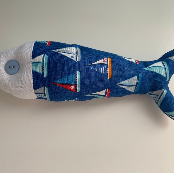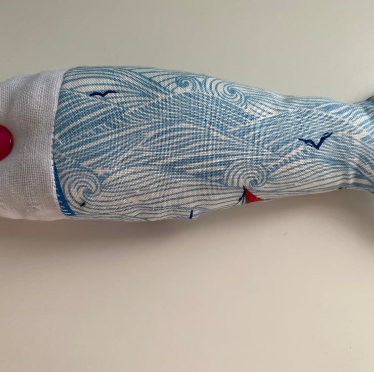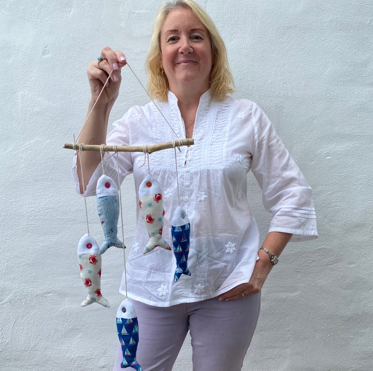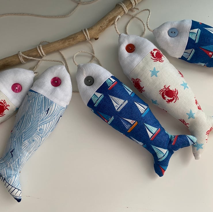 This hanging fish decoration/mobile is inspired by my life by the sea. I collected the driftwood on our daily walk by the sea. The fish are made from Sail Away by Makower, a quality cotton fabric and with cute button eyes! Filled with toy stuffing. Attached to the driftwood by simple string.