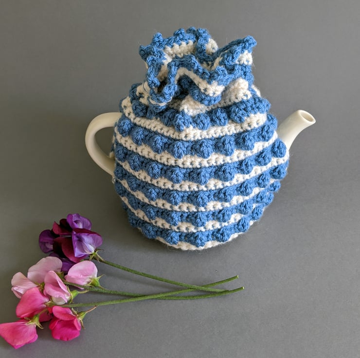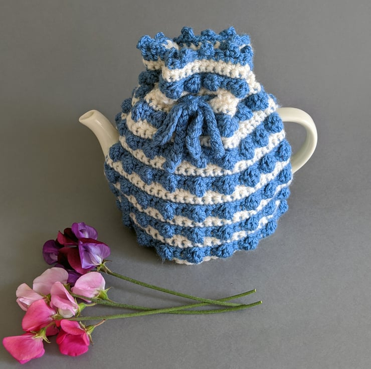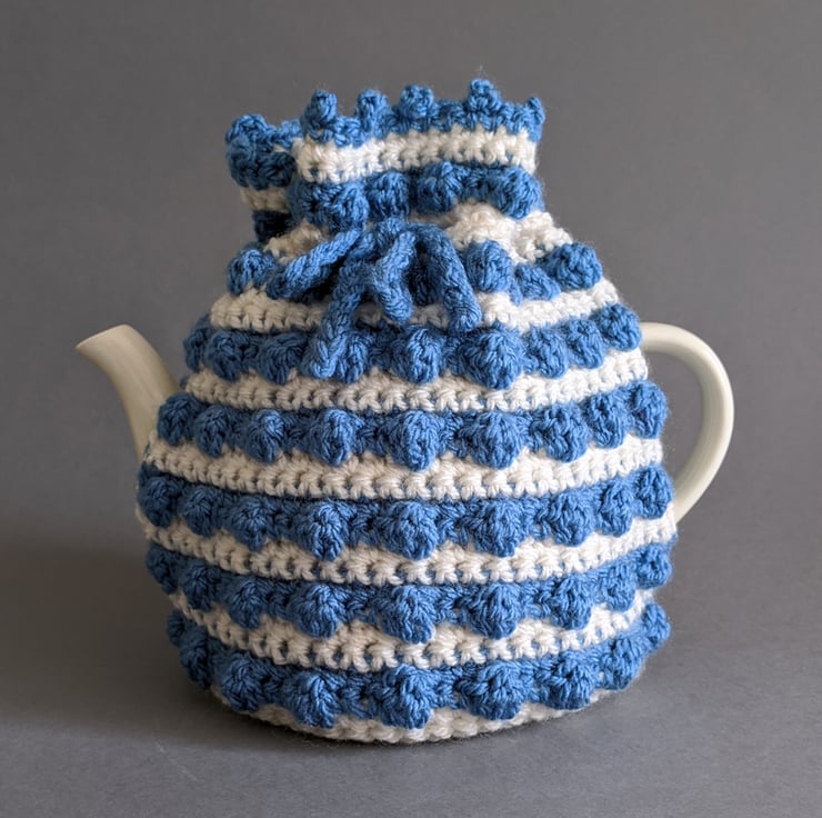 Crocheted from a wool/acrylic blend yarn, the texture created by the bobbles makes a lovely thick fabric to keep your tea warmer for longer. Stripes of cornish blue and cream compliment each other and would grace any kitchen table.