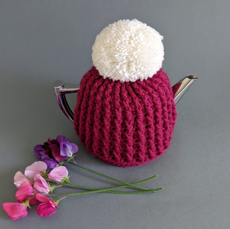I'm a big fan of teapot cosies and this one was inspired by the PomPom hats I have been making. I love the contrast between the pink base and the oversized cream pompom.