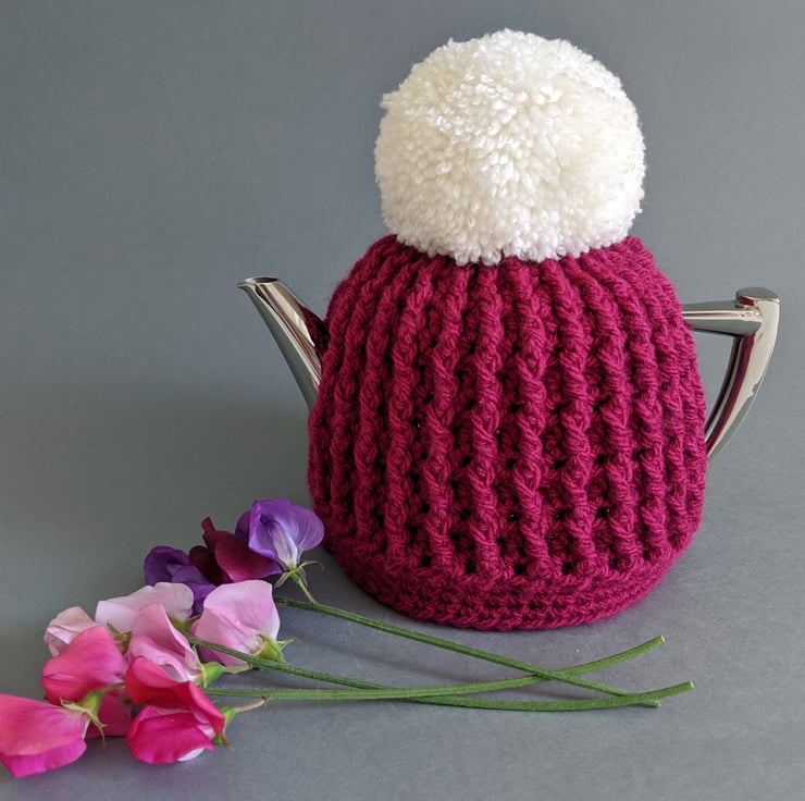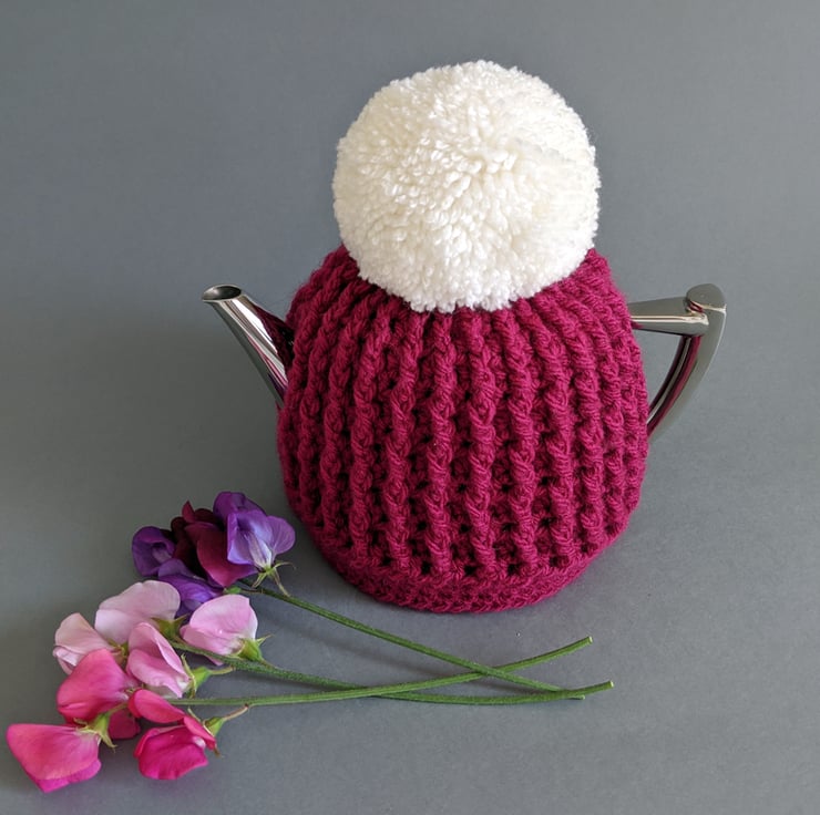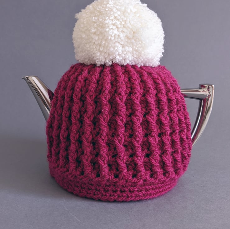 Crocheted from a wool/acrylic blend yarn, this small teapot cosy looks like a Pom Pom hat for your teapot and would grace any kitchen table.