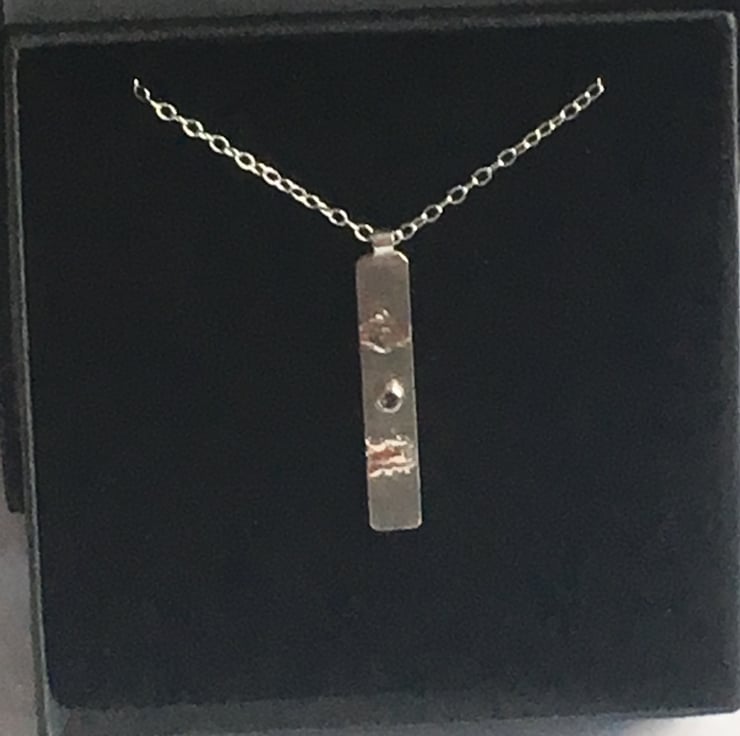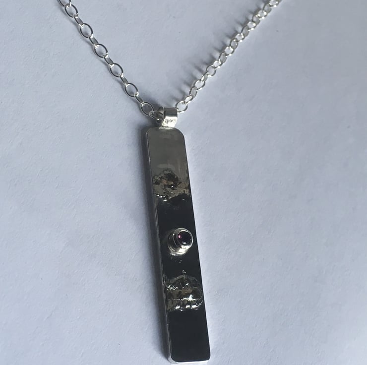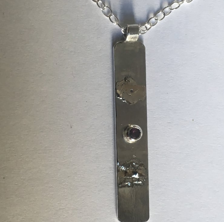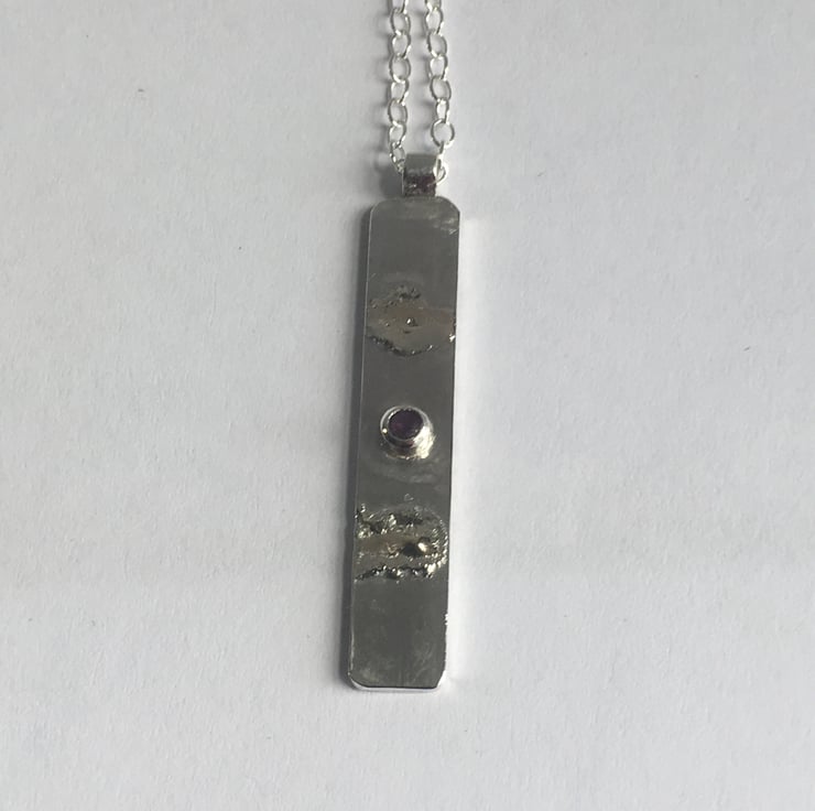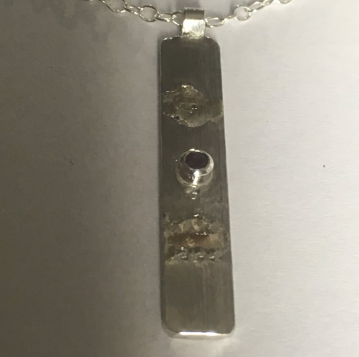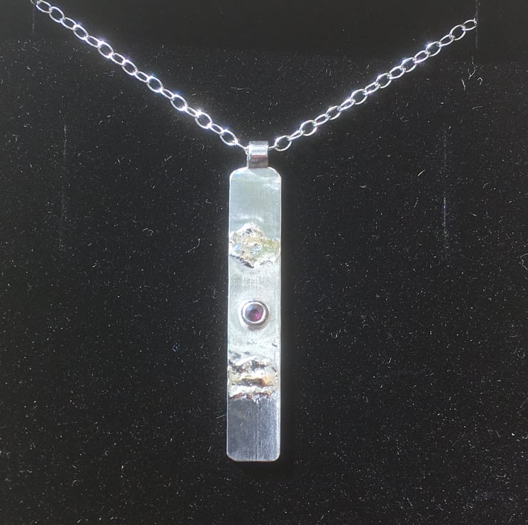 This elegant pendant is a simple sterling silver bar with 9 carat gold fused to it to create organic pools of detail and has been hand set with a 2.5 mm deeply coloured natural Ruby which is the birthstone for July. The chain and findings are Sterling silver. This piece has been designed for therapeutic qualities and as a tactile and wearable object for grounding.