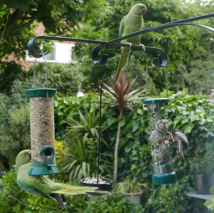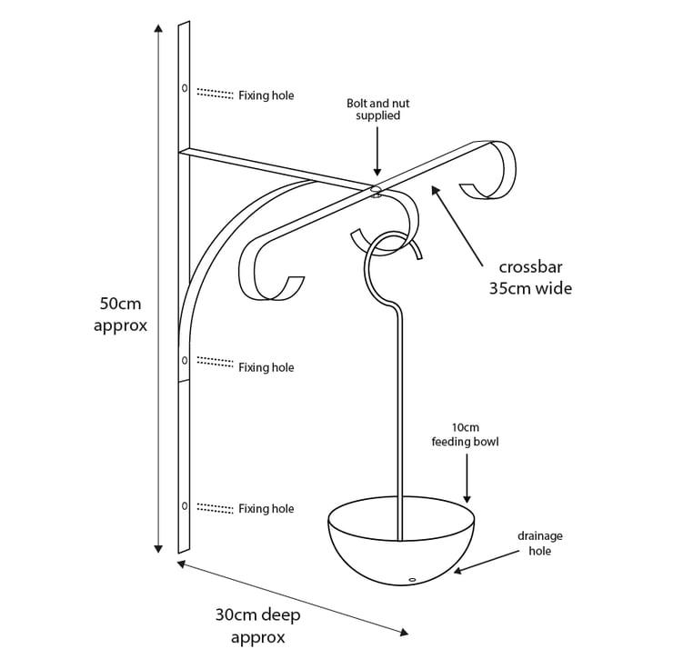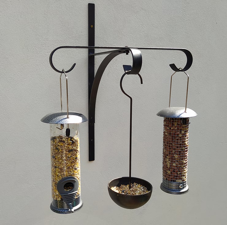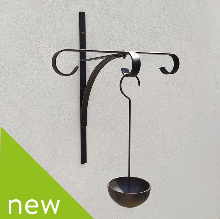 Handmade bird feeder bracket with hanging bowl. Position on wall, fence, post, trellis etc. Hang additional bird feeder from either end. Hanging bird feeder bowl includes drainage hole. Size: 50cm tall x 30cm deep x 35cm wide. Made from 2-3mm mild steel, finished in rust resistant black. Left and right bird feeders in pics 2 & 4 and seed in hanging bowl not included. Not suitable for hanging baskets.
