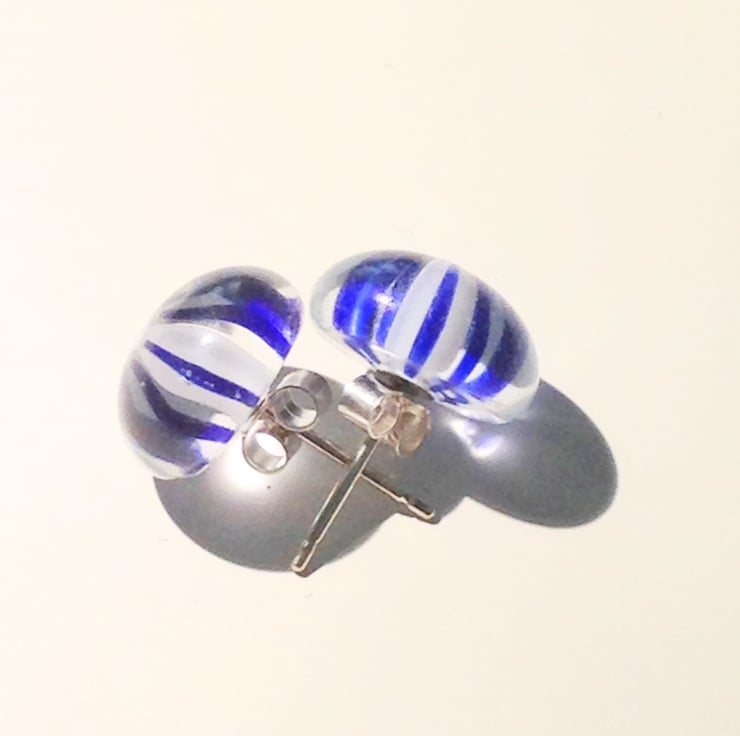 These lovely earrings have attractive blue colours encased in clear glass, reminiscent of mini glass paperweights.