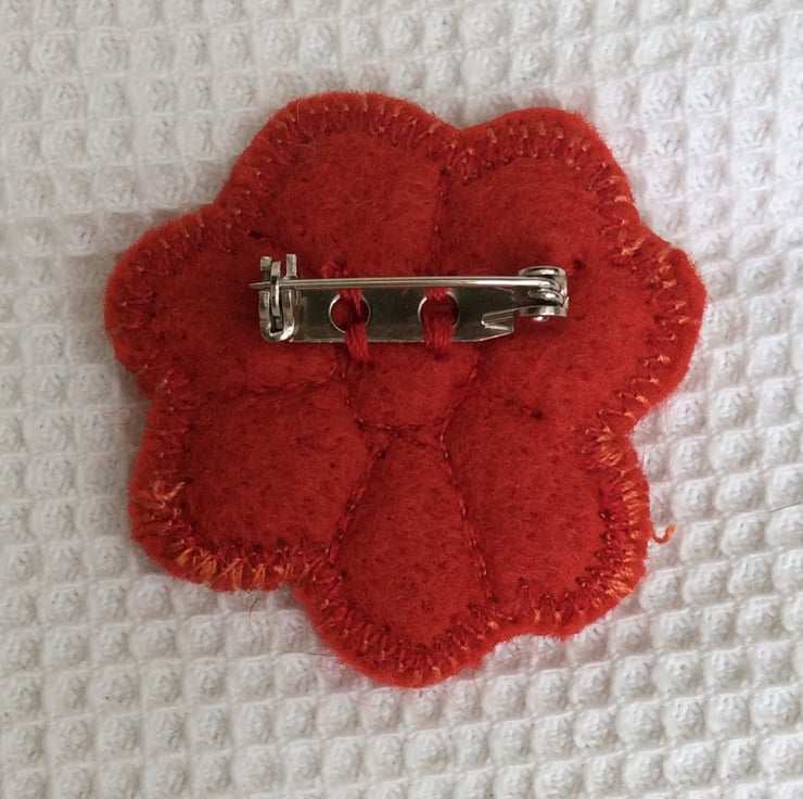 This small orange yellow flower has been carefully cut from a printed woven fabric and machine stitched to a matching felt backing. There is a 2cm brooch pin hand sewn to the back. The brooch measures approximately 4cm across.