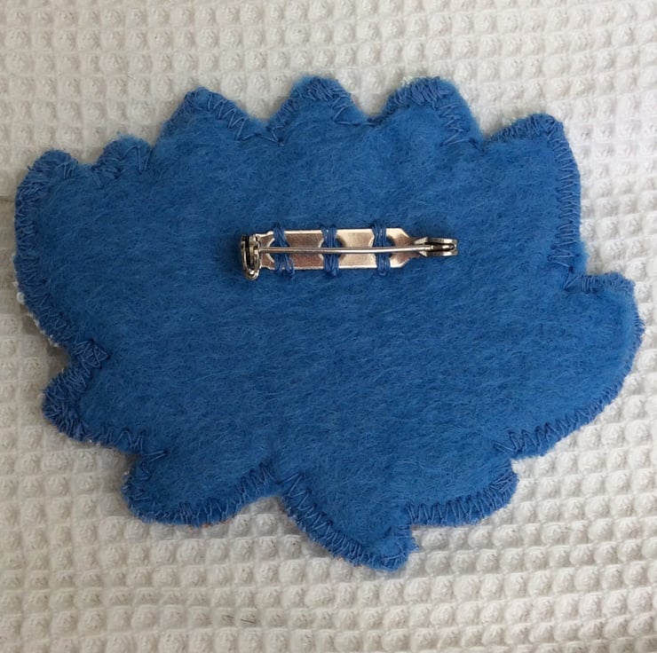 This blue lace flower has been carefully cut from a lace fabric and machine stitched to a matching felt backing. There is a 2.5cm brooch pin hand sewn to the back. The brooch measures approximately 8cm x 6cm.