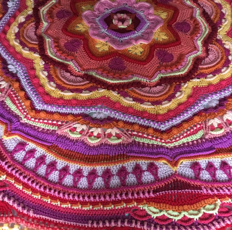 This large circular throw is made from the very bright, colourful hydranga Stylecraft special colour palette. It will brighten any room, and would look just as amazing on a sofa, as a double bed