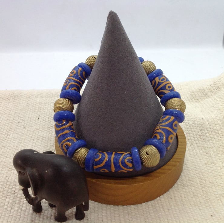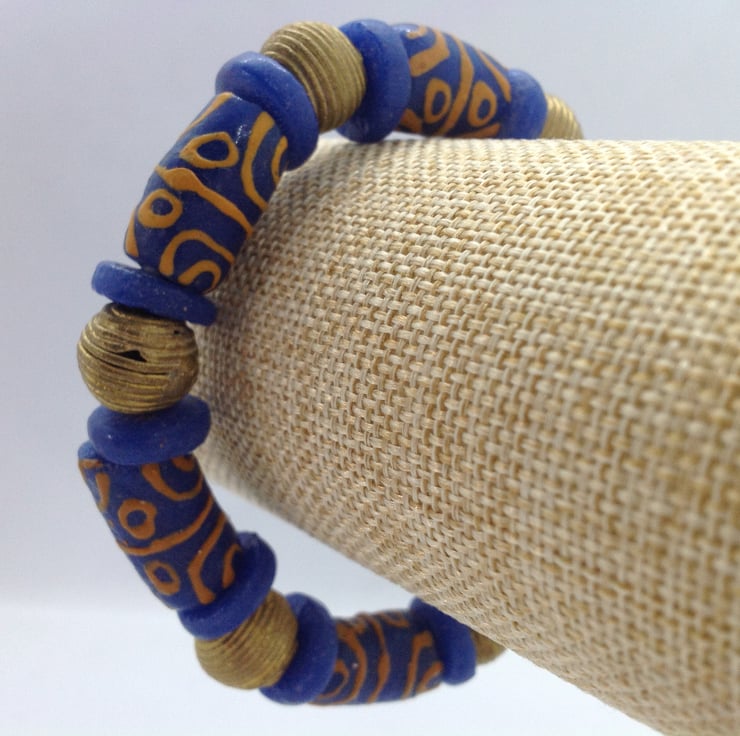 A large bracelet with handmade glass and brass beads from the Krobo region of Ghana, made in African village workshops from recycled glass and then strung here in Shropshire.