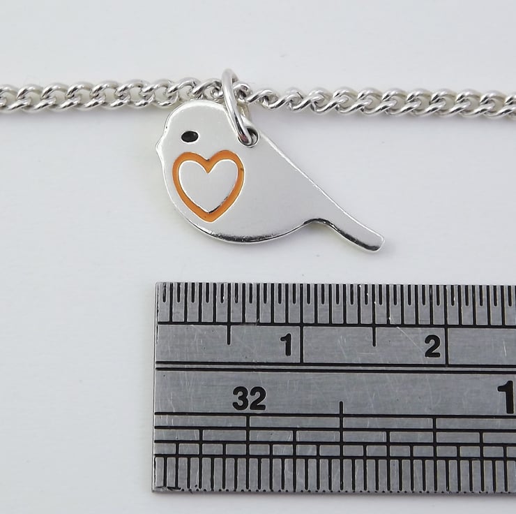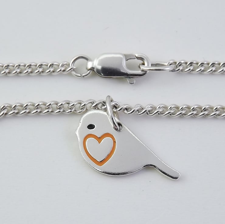 This robin anklet has been lovingly crafted by hand, it's made from sterling silver sheet and is etched before being cut out using a piercing saw, the edges are then smoothed using files and emery paper before it's carefully given there shape using a punch and hammer. A 5mm oval jump ring is then attached. Black and orange resin based enamels are added to the etched areas and then the charm is polished before being attached to a chain.