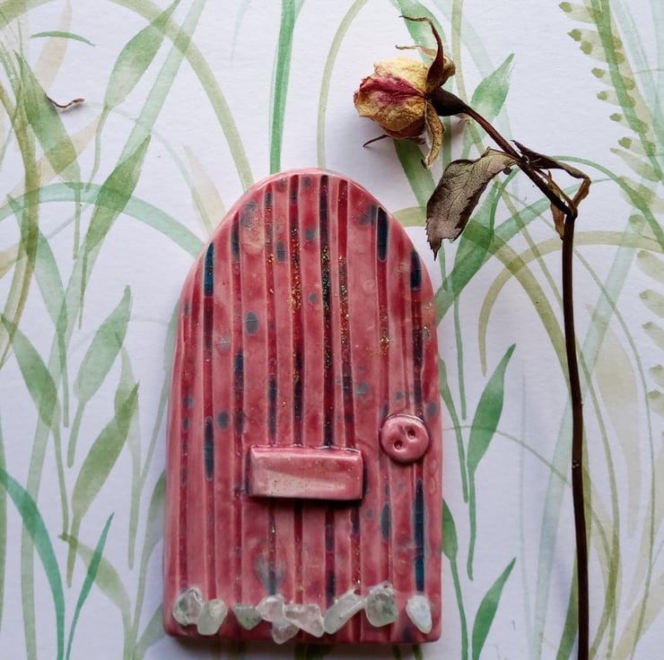 This fairy door has some lovely pale green gems attached along the bottom of the door and dotted over the surface, which compliment the deep pink / turquoise glaze and pale green glitter. The fairy door measures 8.5 cm to the top of the arch, it is one of the smaller designs I make.