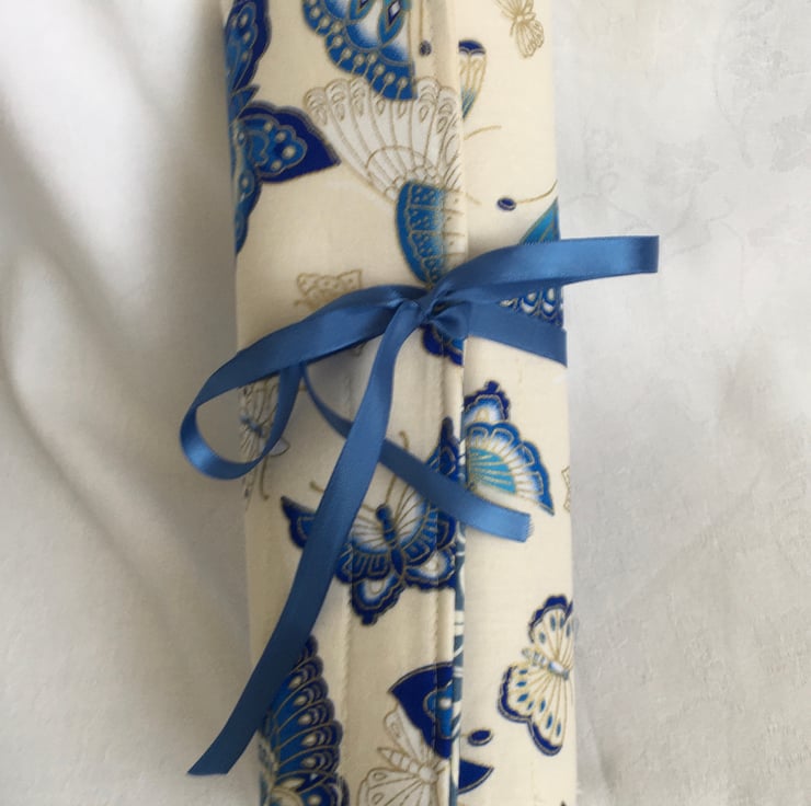 This is a beautiful brush roll for all those essentials, to be easily stored and kept in one place. A brush roll that also helps to keep the brush bristles in perfect condition. Not only is this make up brush roll, elegant looking, it is also practical and functional. A real must have for keeping all those brushes in great condition and dust free. This would also make a great storage roll for a sewer or artist.