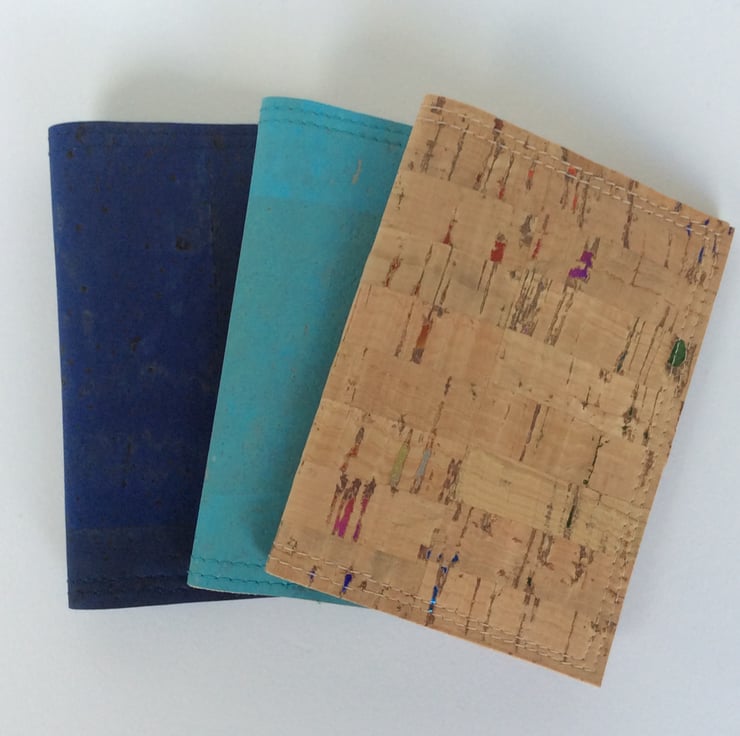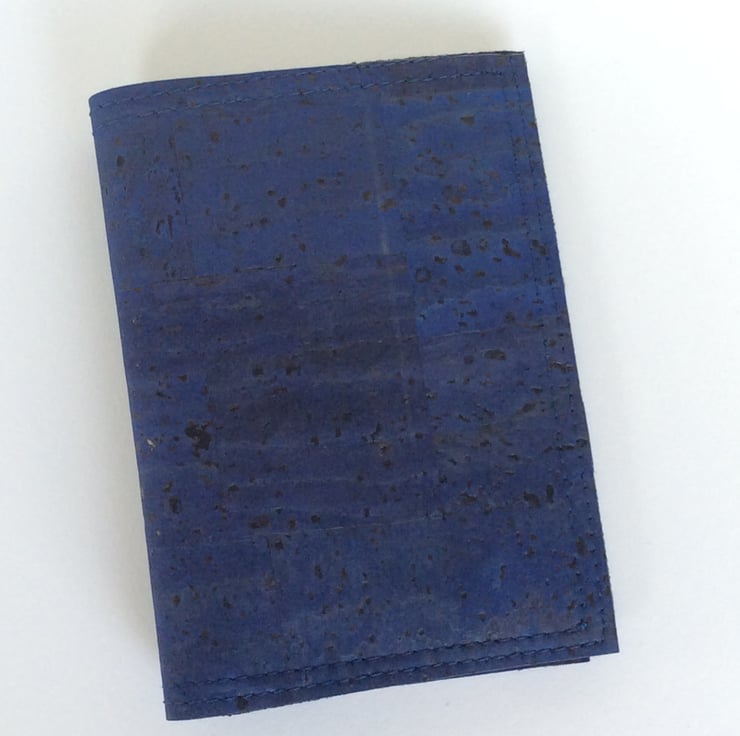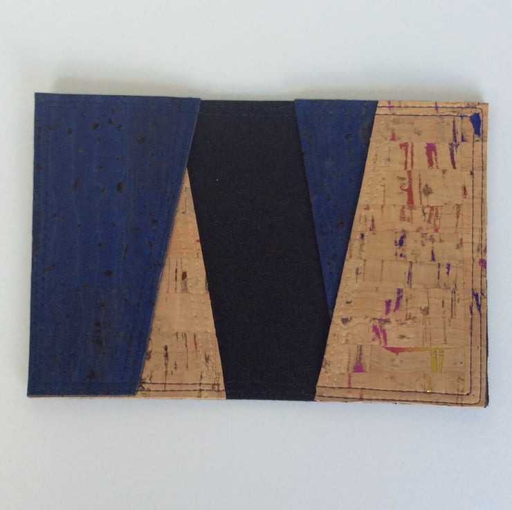 A card holder, or small wallet, hand made from natural cork fabric. This simple folding design is handy for cards or notes and small enough for any pocket. The outside is cork dyed dark, denim blue with a black fabric backing. The asymmetrical pockets are dark blue and natural colour cork with multicoloured shiny flecks.