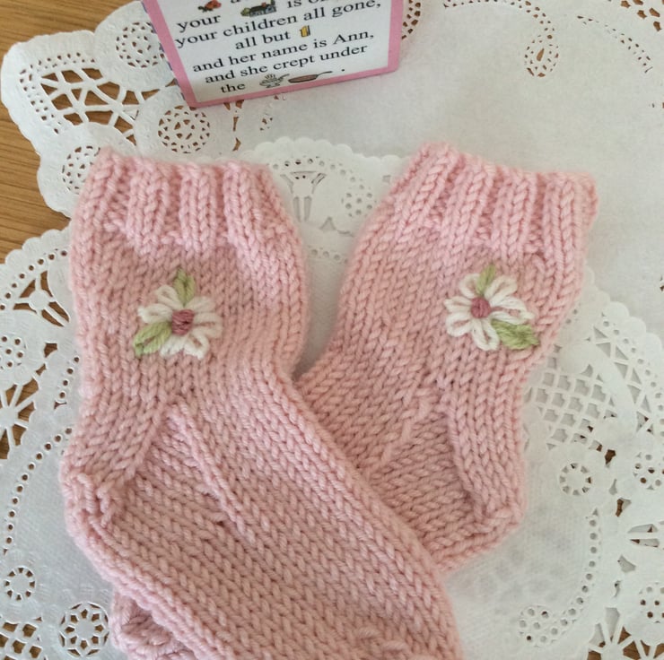 These soft little socks are hand hand knitted by me. They are knitted in a cashmere blend wool that is soft for babies feet but can also be machine washed at 30 degrees.