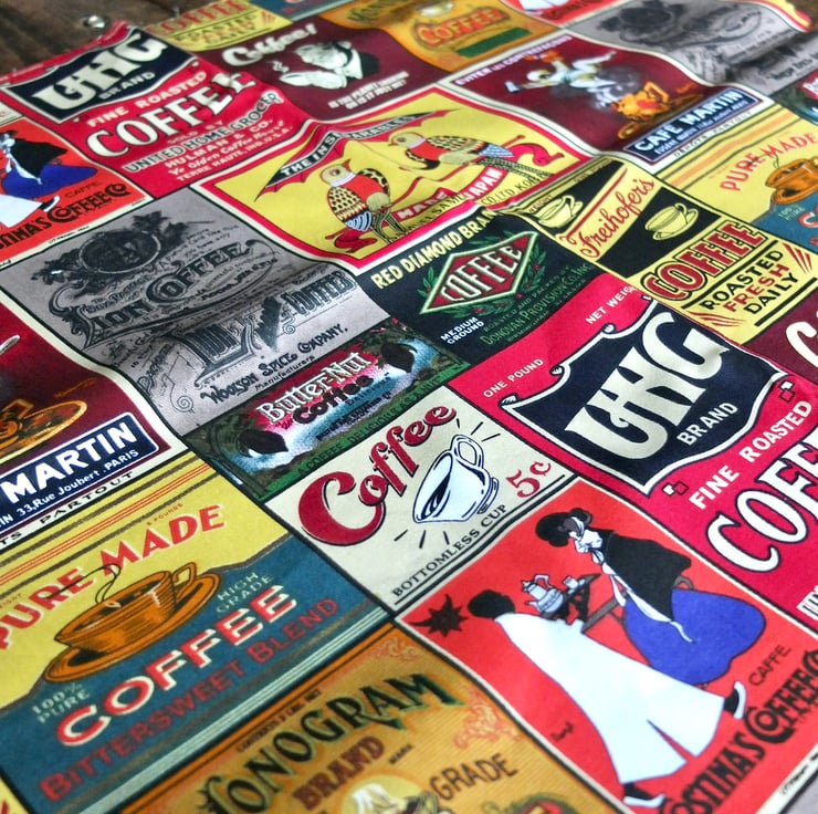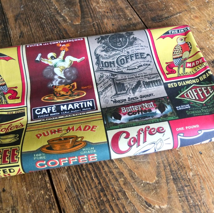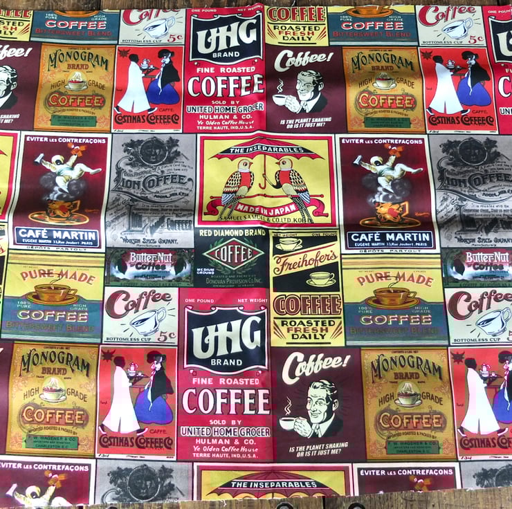 This listing is for 47 x 112cm piece of lovely cotton drill fabric, with Vintage coffee ads print. would make a great cushion cover or maybe even a cafe style curtain!