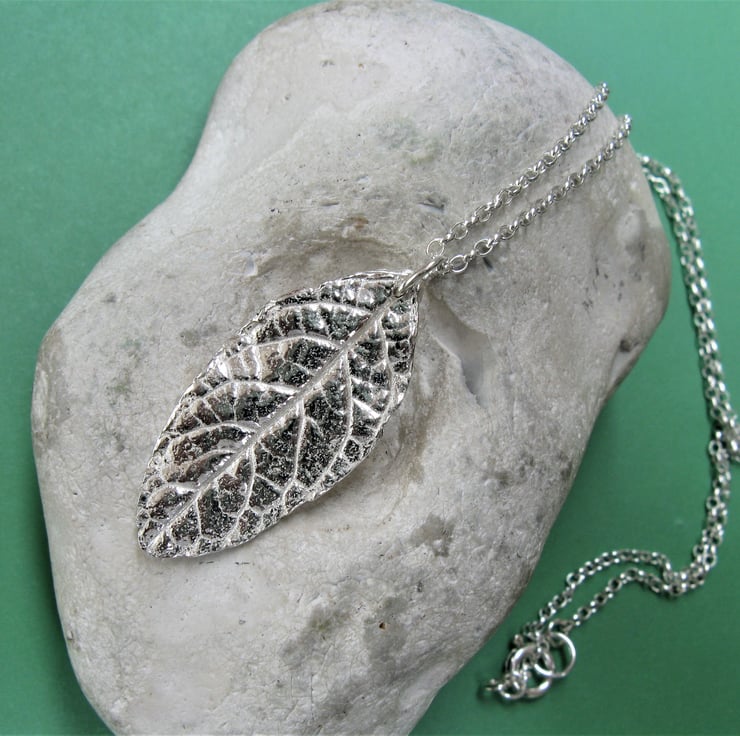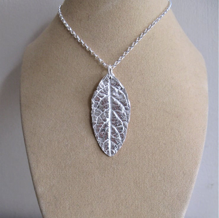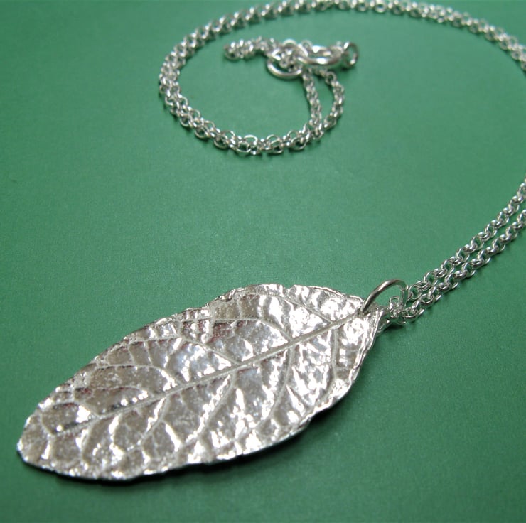 This beautiful necklace was made by coating a real buddleia leaf in multiple layers of recycled fine silver (pure silver) paste, leaving a detailed replica after firing.