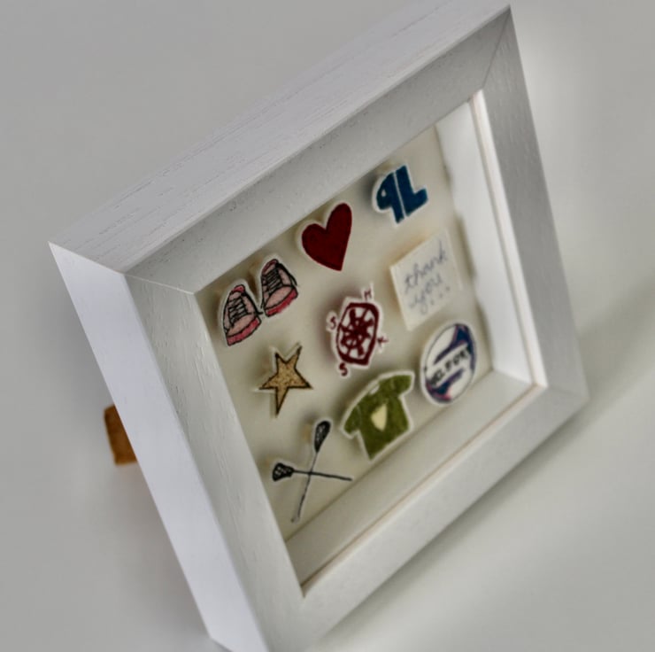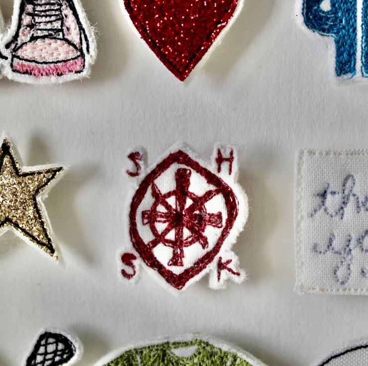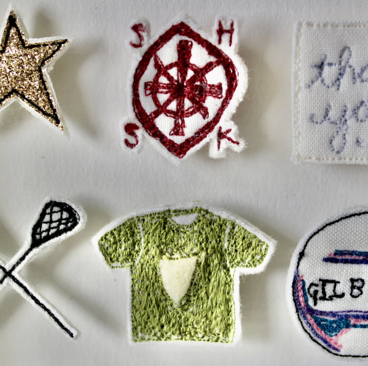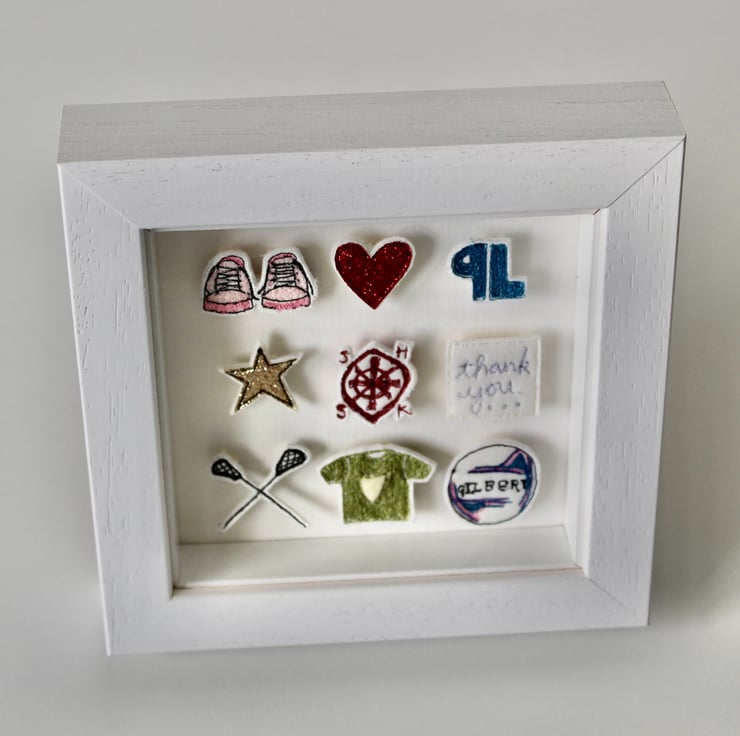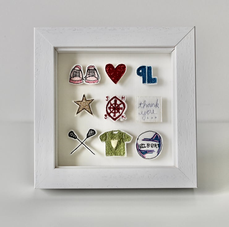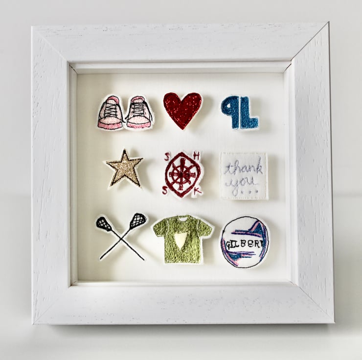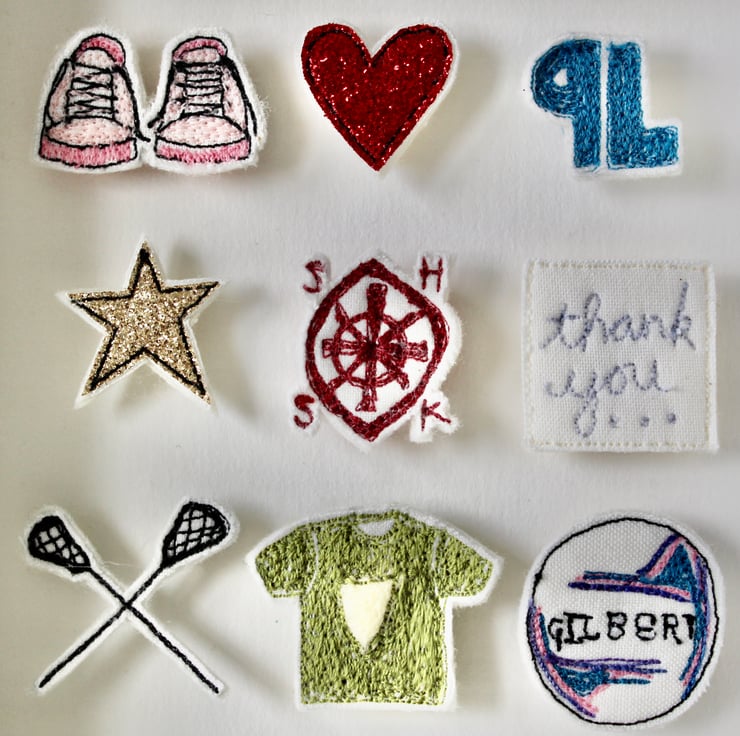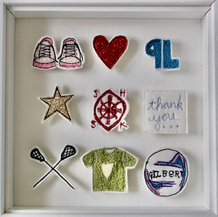 The trainers, heart, 9L, star, logo, thank you, lacrosse sticks, t-shirt and ball are all created using layers of cloth and free hand machine embroidery. Each is cut out by hand using a very sharp pair of scissors.
