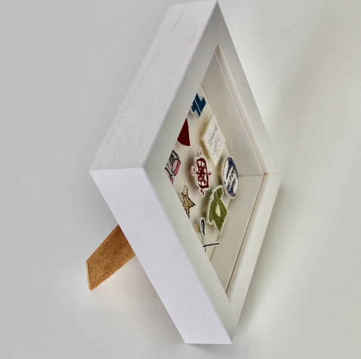 Encapsulated within a white washed box frame, measuring 15.5cm by 15.5cm.