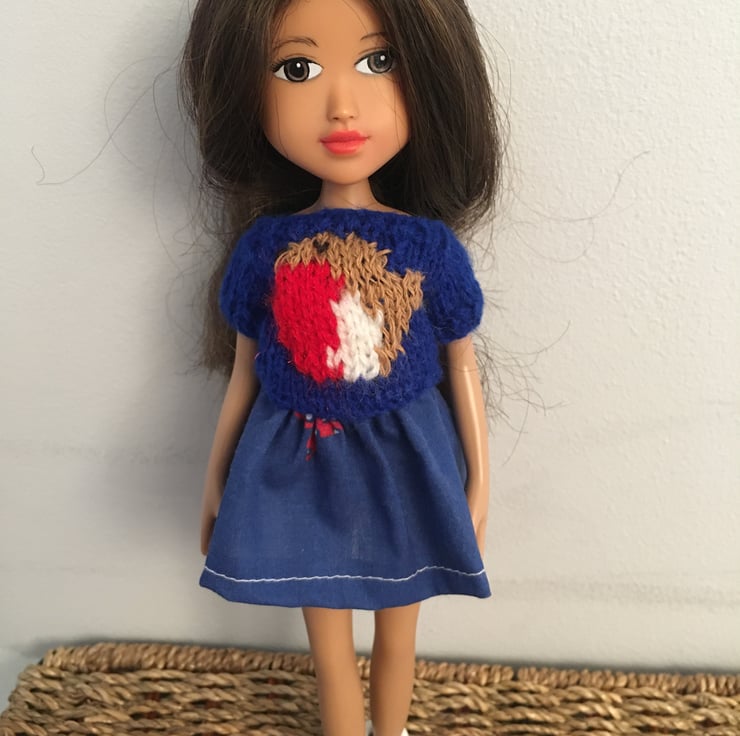 Tina has enjoyed a thorough spa treatment and had her hair detangled, washed and trimmed. After cleaning and sterilising a new face has been repainted on by hand using non toxic paints and sealed to give her a fresh, natural look. Tina has a cute outfit, a hand knitted sweater in blue with a robin motif and a matching cotton floral skirt and pop on and off shoes hand sculpted from silicone.
