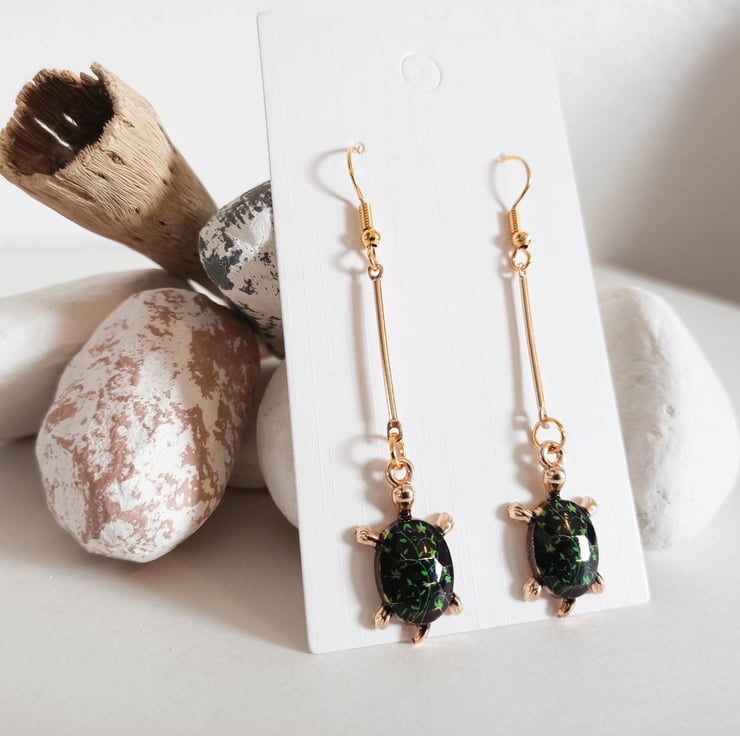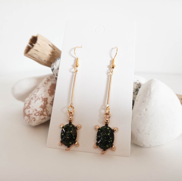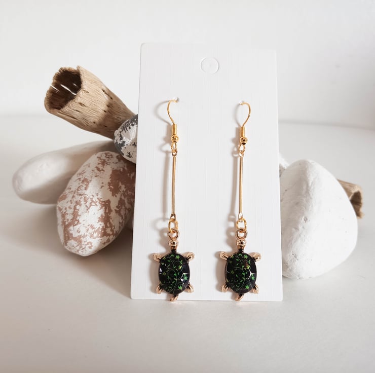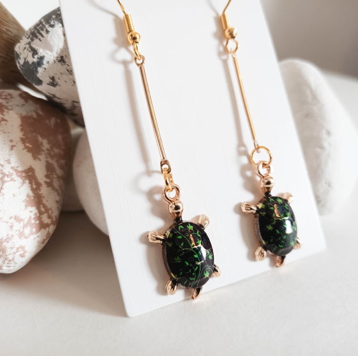 The main feature of these gold plated dangle earrings are the gold tortoise pendants which have a black shell and green leaves detail. The tortoise pendants hand from a gold connector bar.