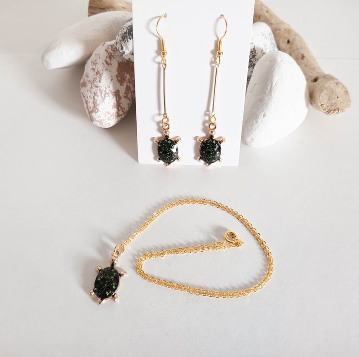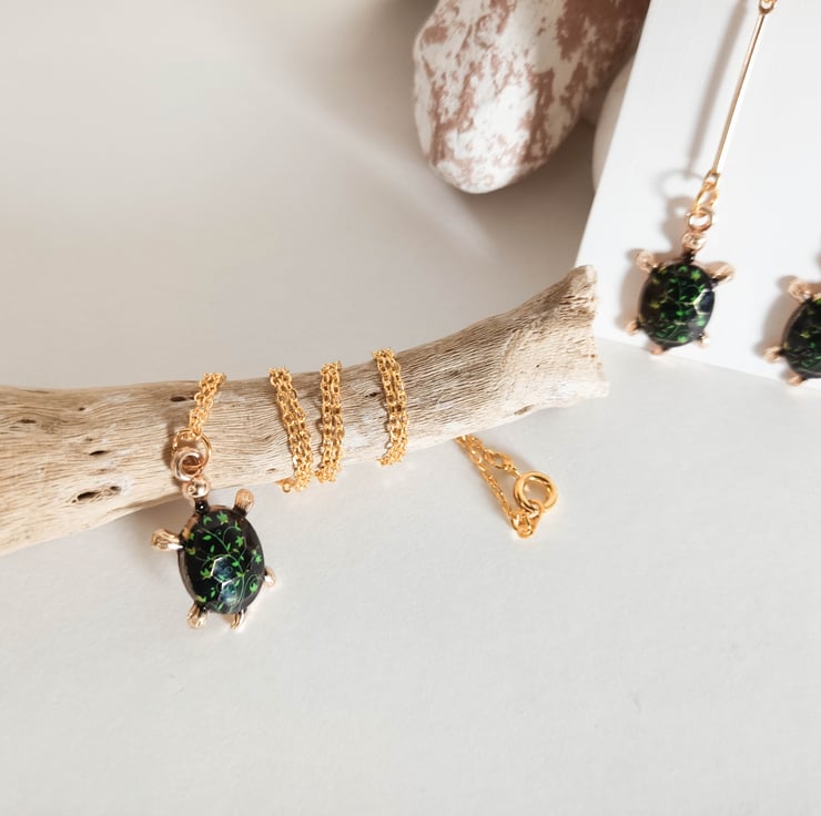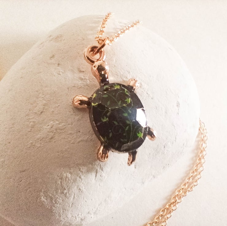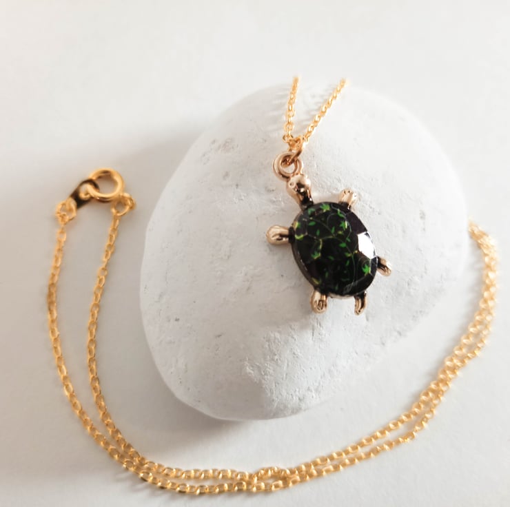 This necklace has a gold tortoise pendant, which has a black shell with green leaves detail. The tortoise pendants hangs from an 18inch gold coloured brass necklace.