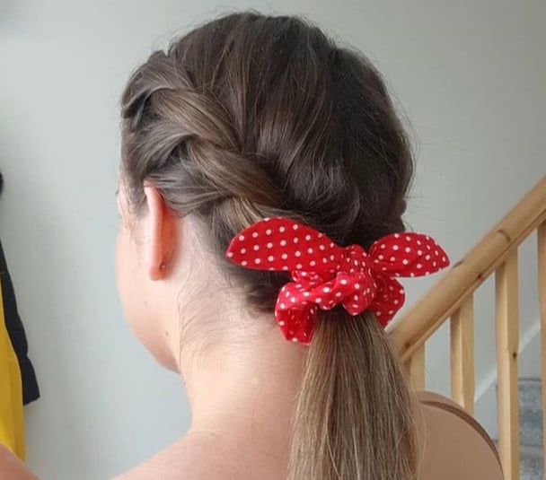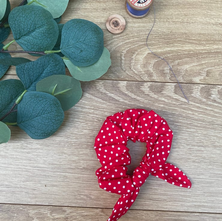 Supplied is red with white dots scrunchie.