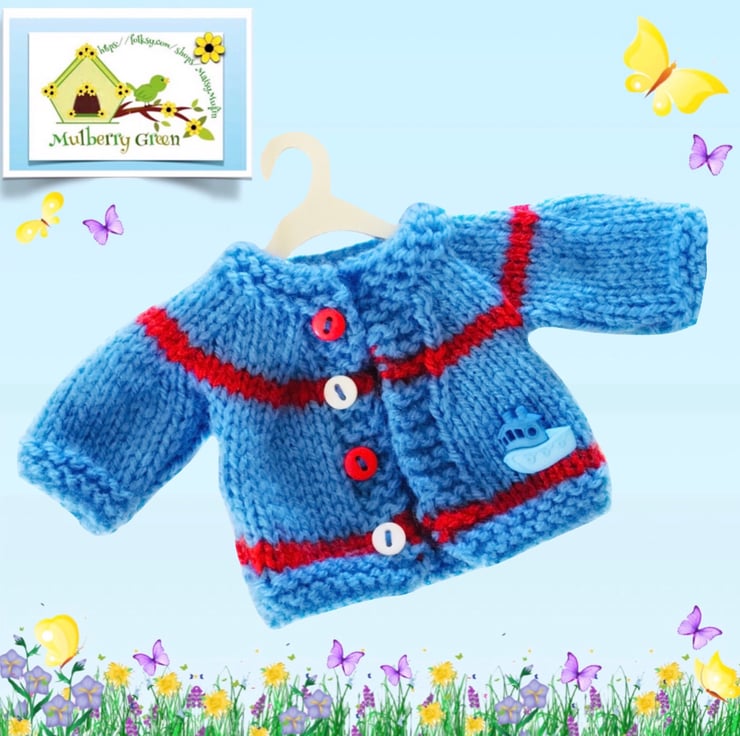 A smart nautical cardigan to fit the Mulberry Green characters, in a lovely azure blue with red stripes. The cardigan is hand knitted and is decorated with tiny red and white buttons and a little sailing boat. It comes on a cute little wooden hanger. A matching jumper is also available.