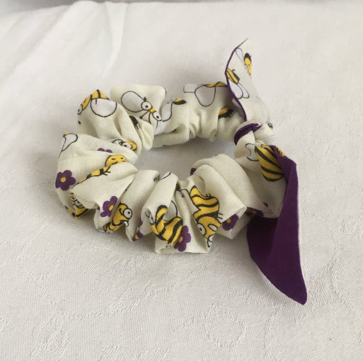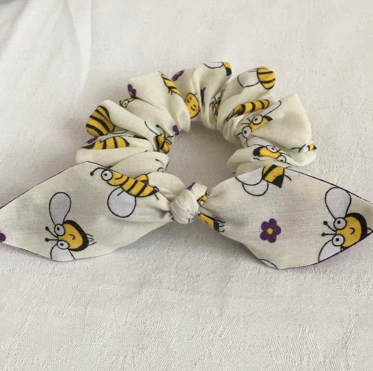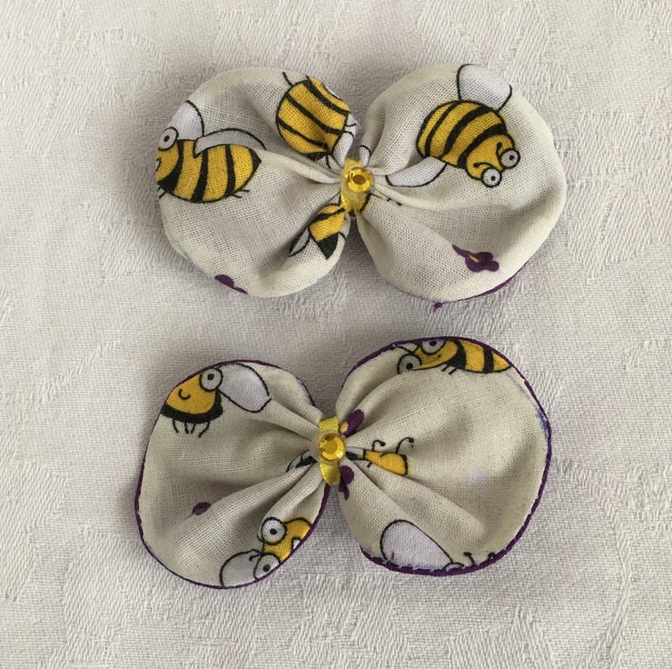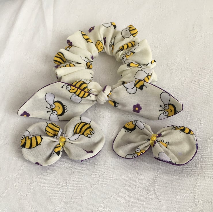 Why not treat your hair to this fun unique Bee hair accessories set, to charm and delight and top off any hair style. This is a real fun hair accessories set, comprising of a Bow Scrunchie, along with two Bow Hair Clips, all in the same fabric, with a happy Bumble Bee and flowers print.