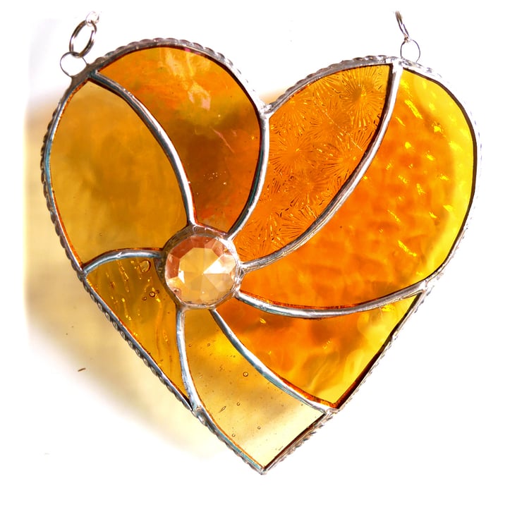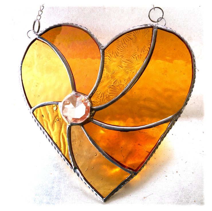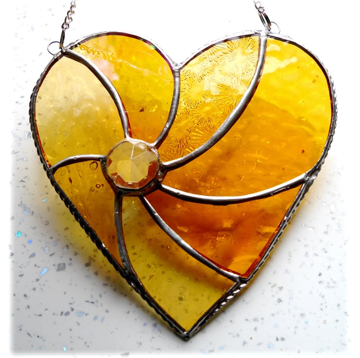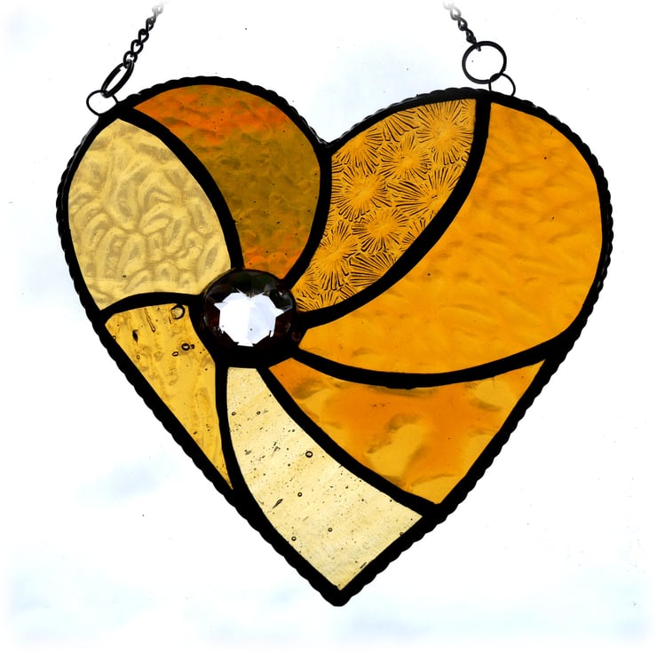 I've made the heart from 7 types and colours of gold glass and set them in a swirl round a large sparkling crystal.