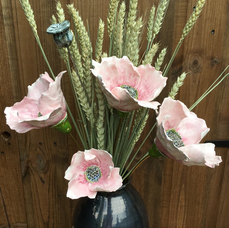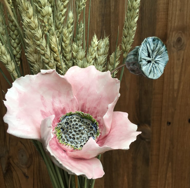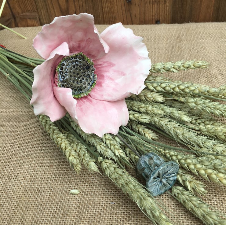 The poppy head is on a long hard wire stem so it is easy to arrange both in a vase or in a bouquet. Each poppy head measures approx 12cm diametre, but every flower is unique so there will be a slight difference with each one.