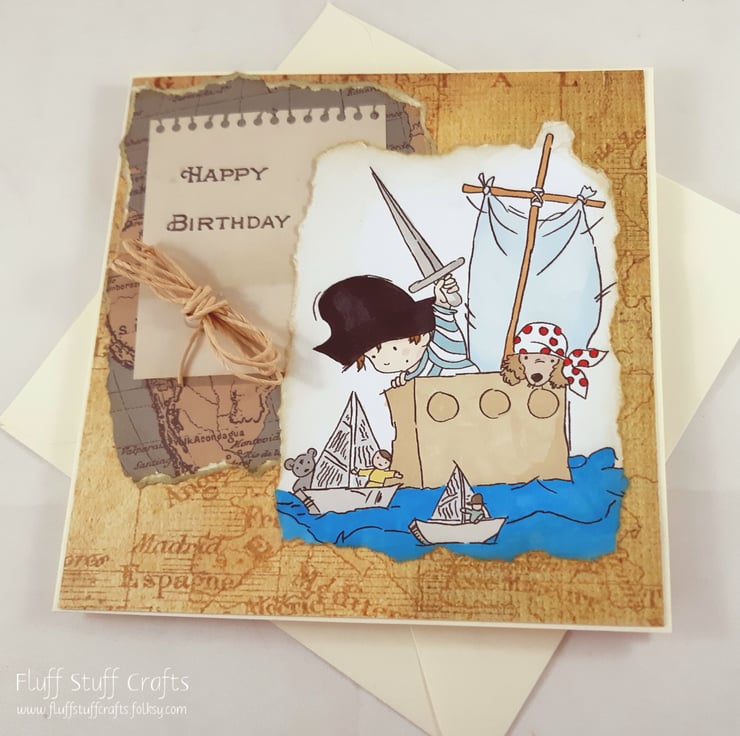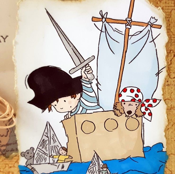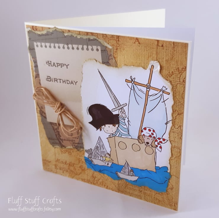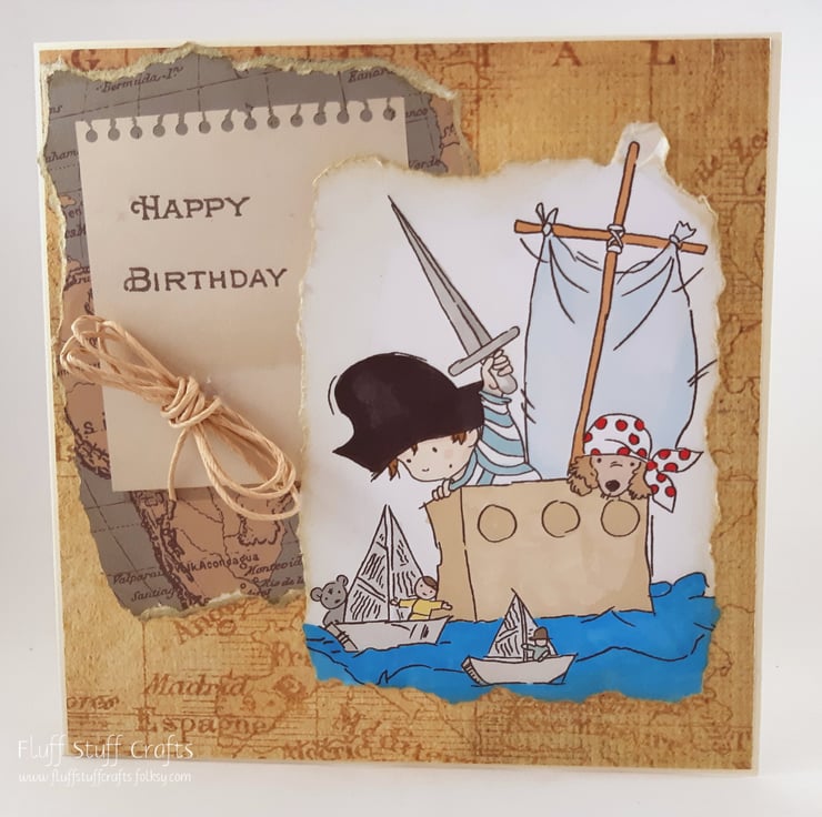 Square birthday card featuring a hand coloured image of a child playing at being a pirate with their dog, in a homemade cardboard box ship. The image has been ripped around the edges and overlaid onto an aged map background. The stamped sentiment reads: 'Happy Birthday'. The card has been embellished with a small tied rope.