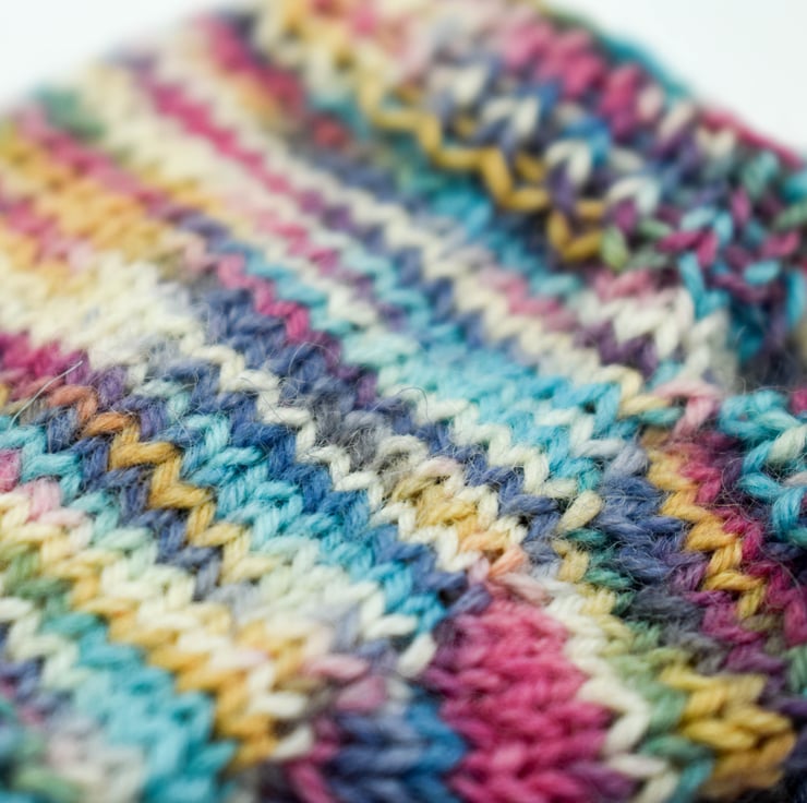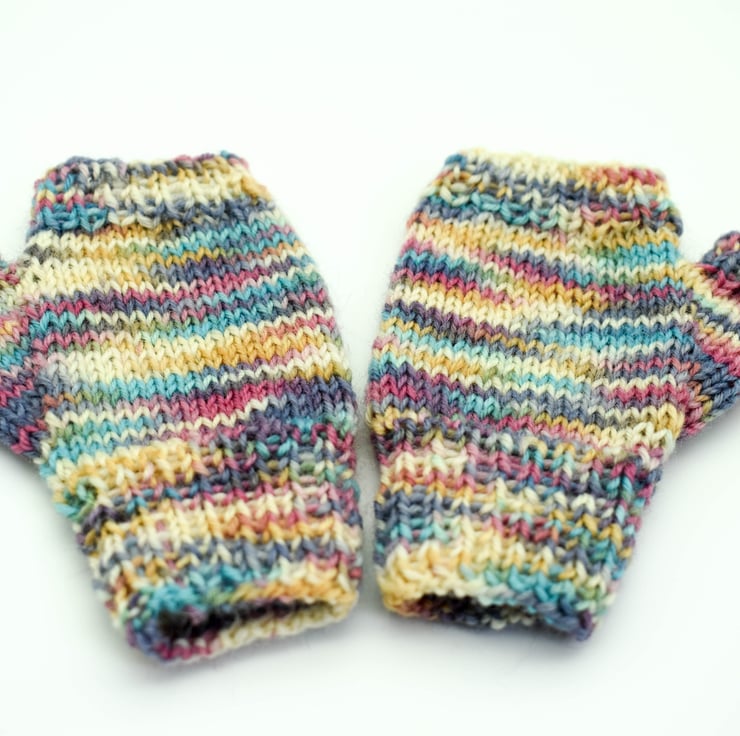 Fingerless mittens are ideal for toddlers who are always on the go, keeping their hands warm but their fingers still free to explore! The wrist band is knitted in stretchy fisherman's rib which keeps its shape well. This multicoloured yarn has cream, pink, peach, purple and turquoise running through it.