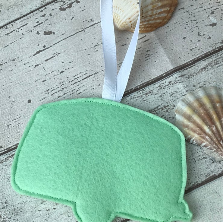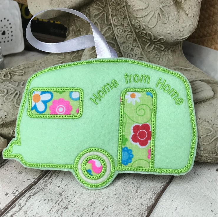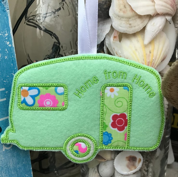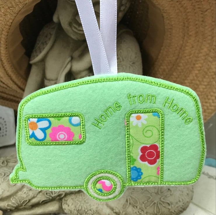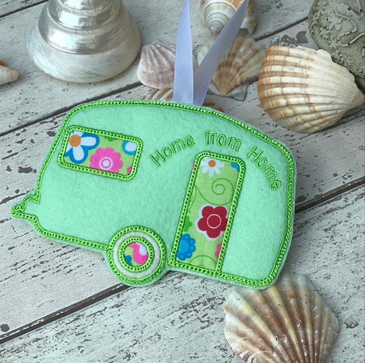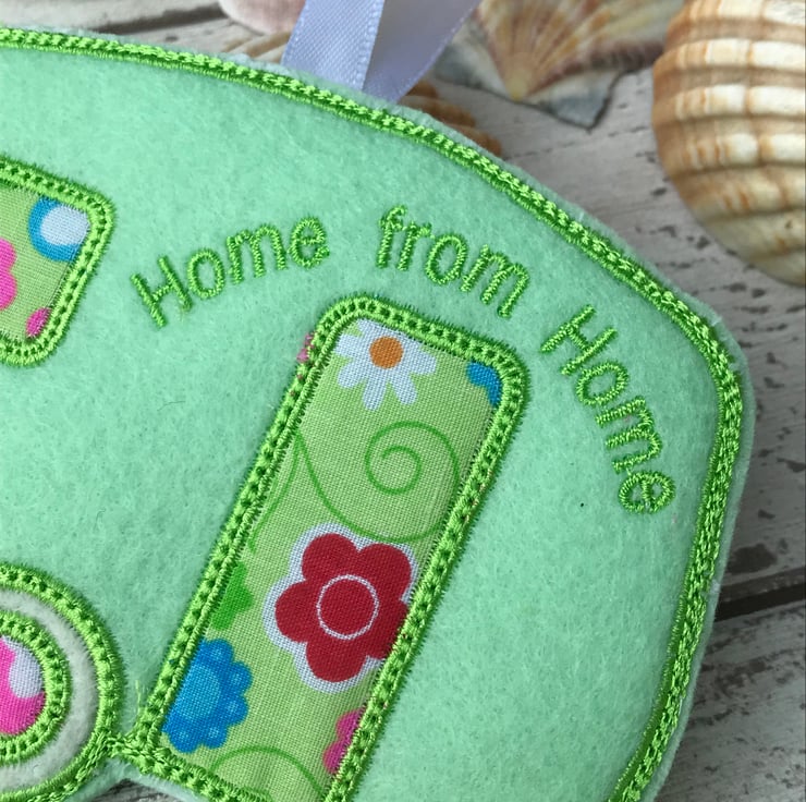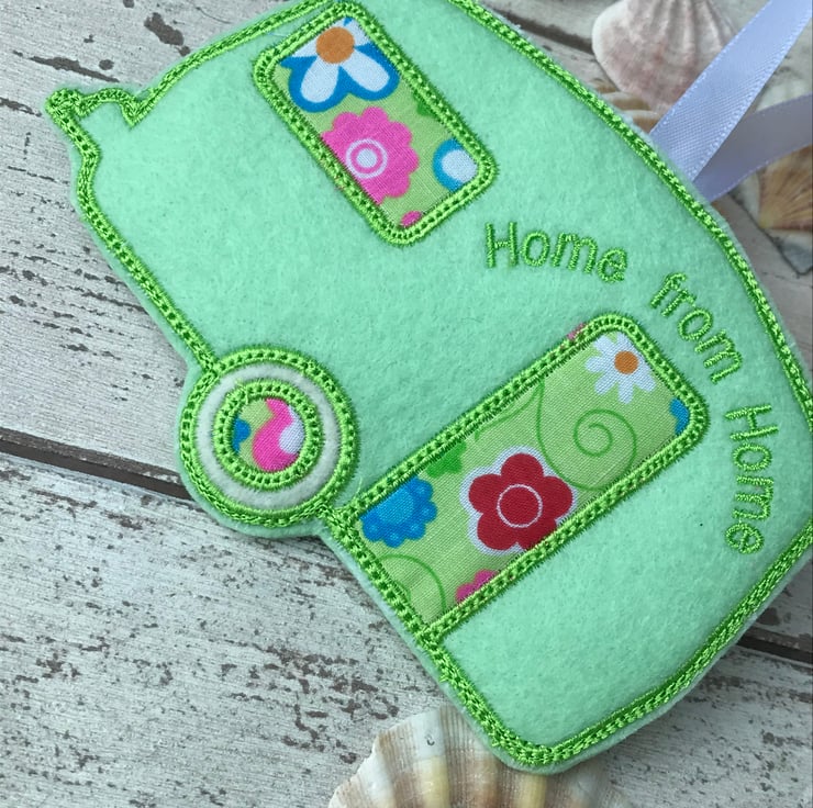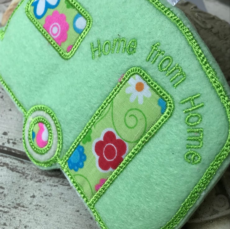 Really sweet and cute boho hippie caravan felt decoration designed by me. A perfect sending gift for anyone missing their caravan. Made with pastel green felt and retro look fabric. In a 80s design era of caravanning. With lime green words Home from Home.