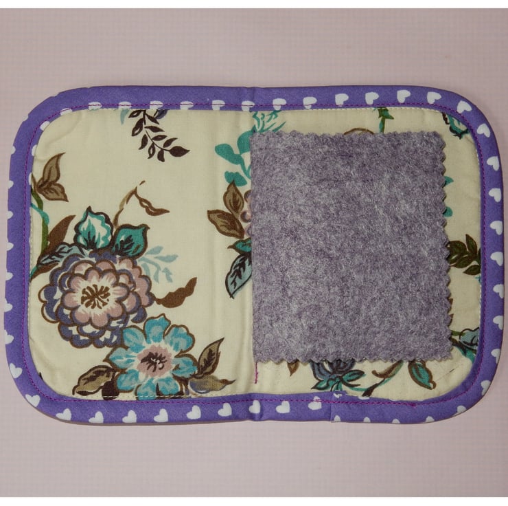 A traditional Liberty print, Ianthe, makes for a touch of luxury in this pretty needle case. It measures approximately 5 x 3.5inches and is lined in a toning Liberty print fabric and has four felt leaves for your pins and needles. It had a purple binding around the edge and a layer of wadding for added body. This would make a lovely gift, or treat yourself.