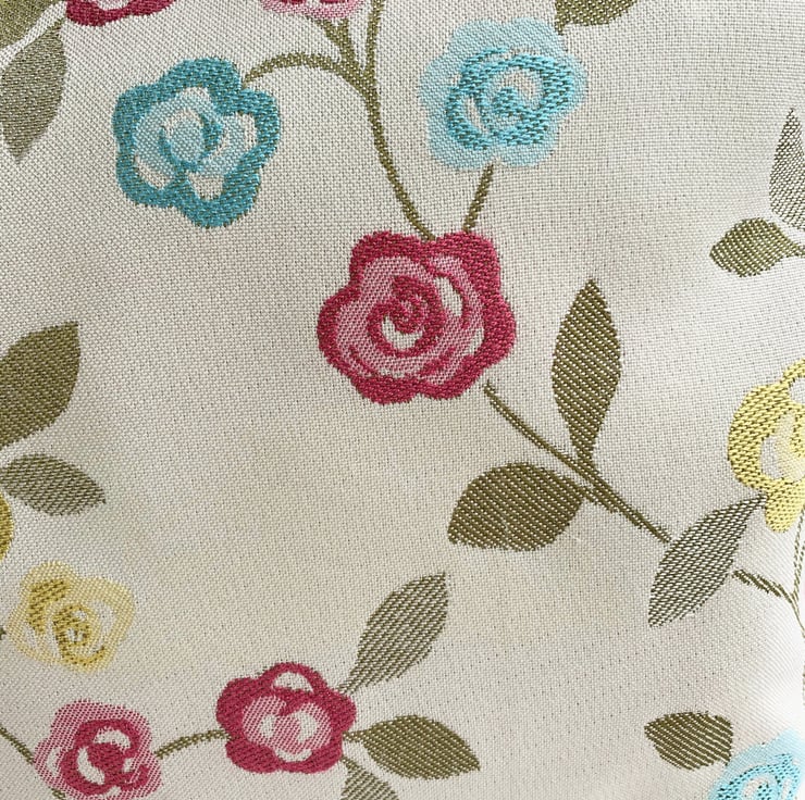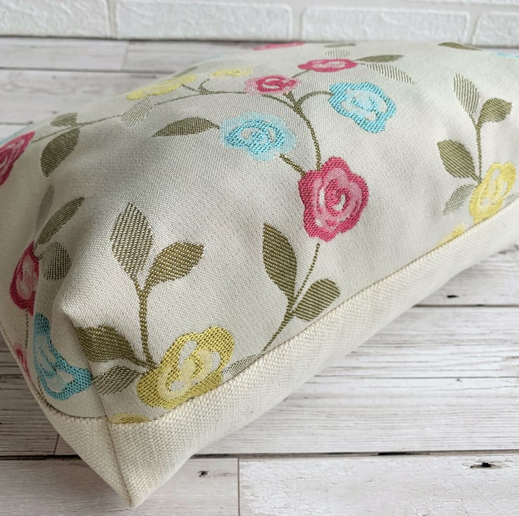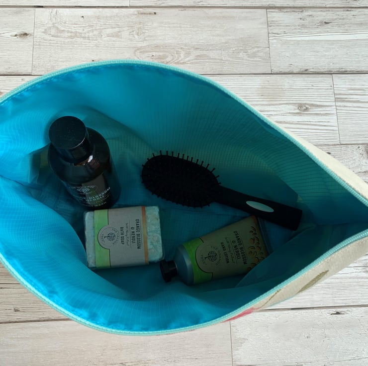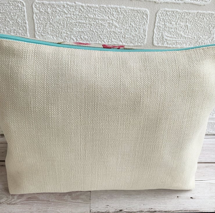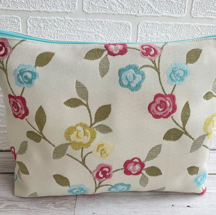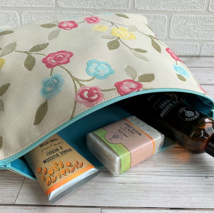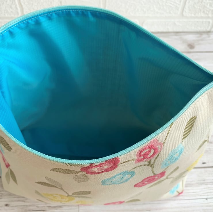 A summery toiletry bag with a floral rambling rose pattern on the front and plain cream fabric on the back. The front fabric is a lovely jacquard fabric with a pattern of small pink, yellow and pale blue rambling roses on a cream background. The stems and leaves are two shades of green. The pattern has a slight sheen against the matt cream background. The bag fastens with a matching pale blue zip and the inside is fully lined with a pale turquoise water-resistant lining. The base of the bag is boxed giving a spacious interior. The fabric is thick but not stiff, so the bag can be flattened when not in use.