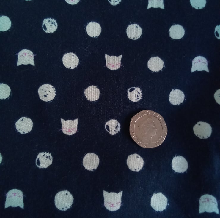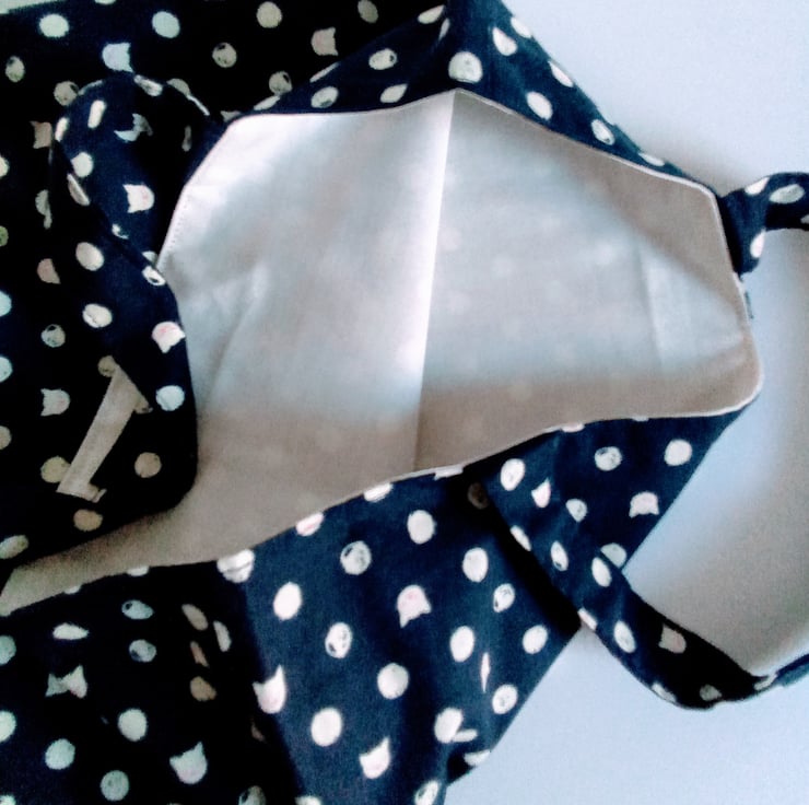 This is a cotton shopping bag with a cat design and a cream lining.