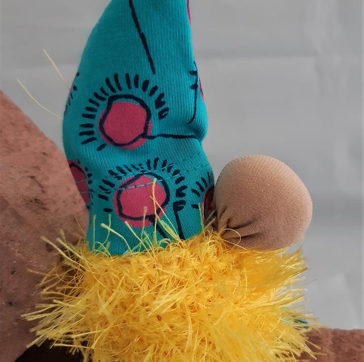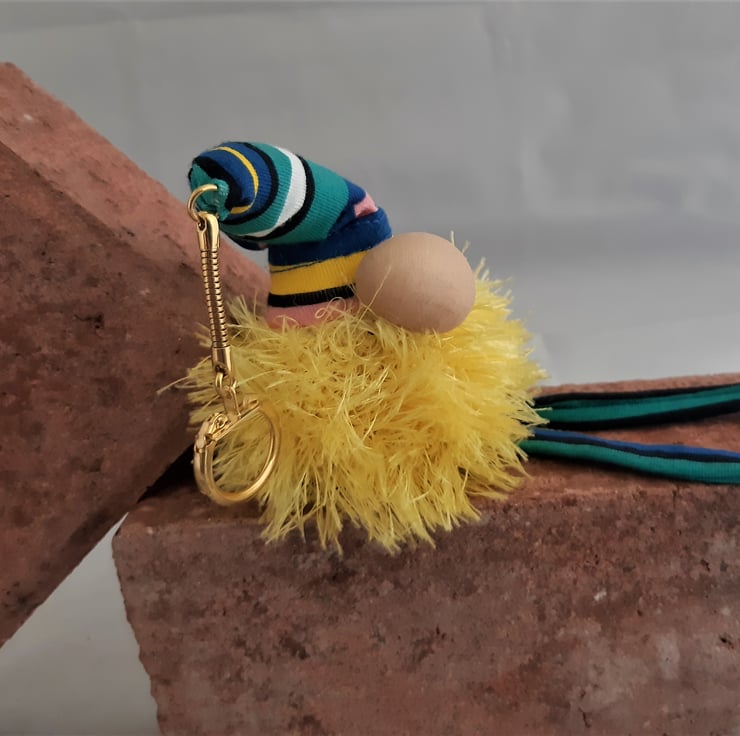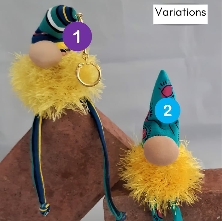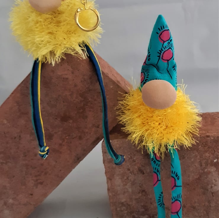 This adorable hand-stitched gnome is a delightful, handcrafted item that doubles as a keyring or bag charm. Each gnome features a gorgeous hand-knitted beard made from eyelash wool, often found in charity shops, adding a cozy, textured touch.