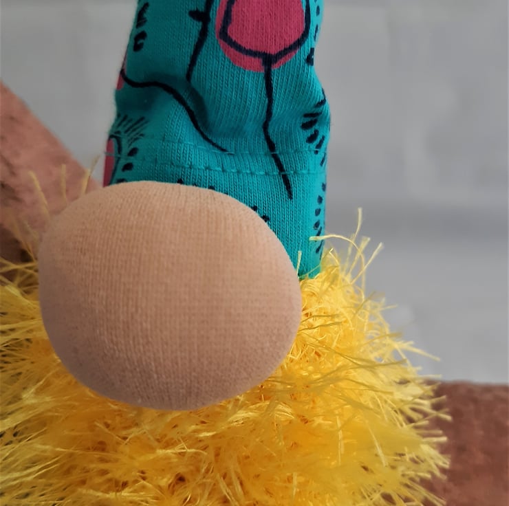Sustainable & Upcycled – Crafted from repurposed T-shirts for the body and hat, and upcycled tights for the nose, giving new life to pre-loved fabrics.