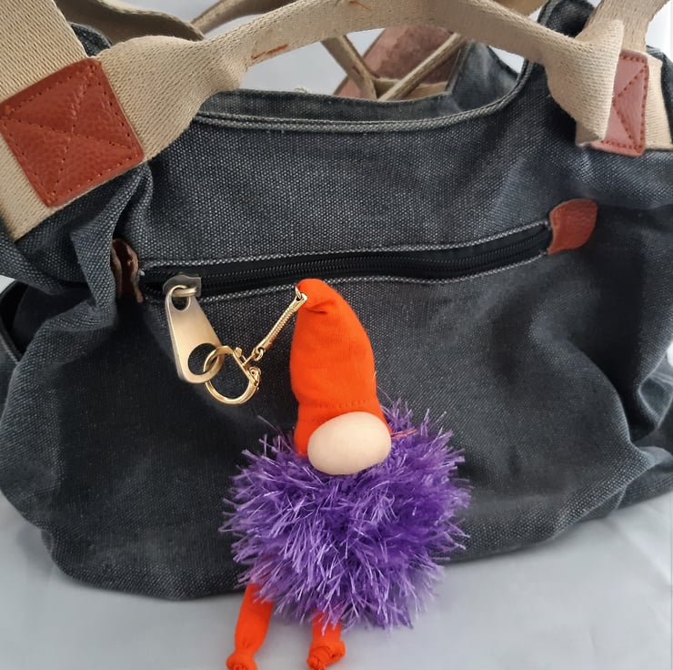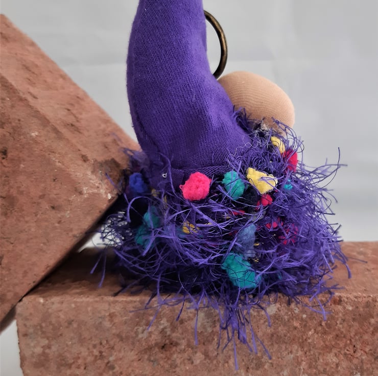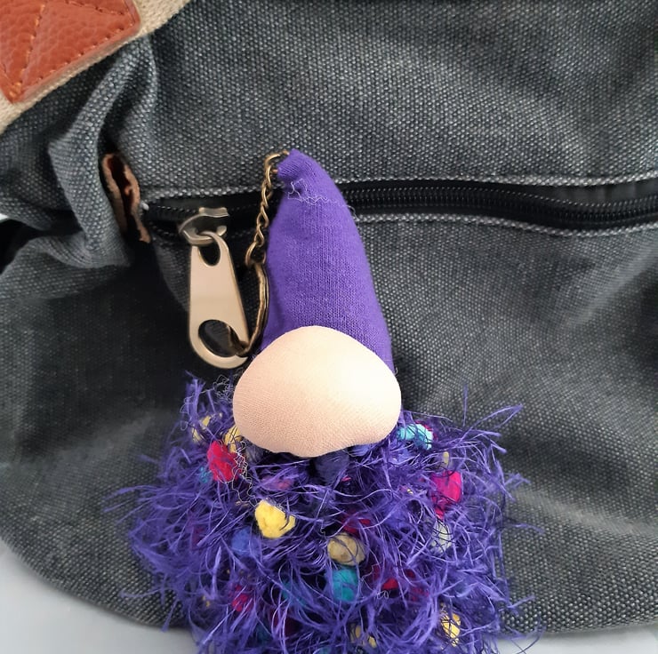 This adorable hand-stitched gnome is a delightful, handcrafted item that doubles as a keyring or bag charm. Each gnome features a gorgeous hand-knitted beard made from eyelash wool, often found in charity shops, adding a cozy, textured touch.