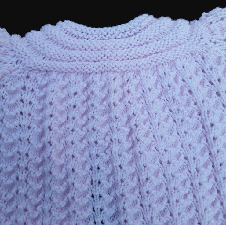 Here's a super cute, hand-knitted pale pink baby cardigan made in the lovely old shale pattern! It's perfect for little ones aged 3-6 months. The old shale pattern creates wavy ridges with eyelets, giving it a beautiful textured look. The lower part of the cardigan and sleeves feature this design, while the yoke has a raised ridge pattern for added detail. It has a round neckline and fastens at the front with three adorable pink heart-shaped buttons.
