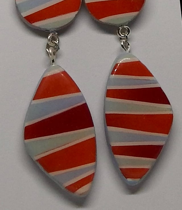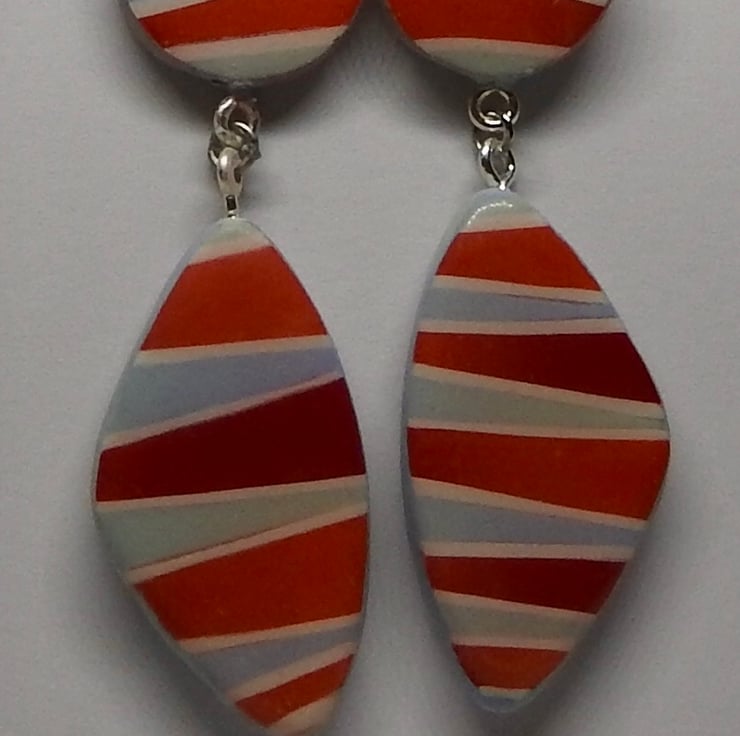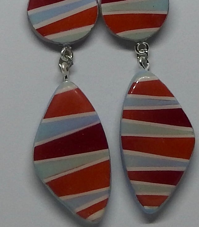 A delightful pair of Striped ceramic handmade earrings Finished in bio resin for strength and shine. Comes supplied in a black velvet pouch.