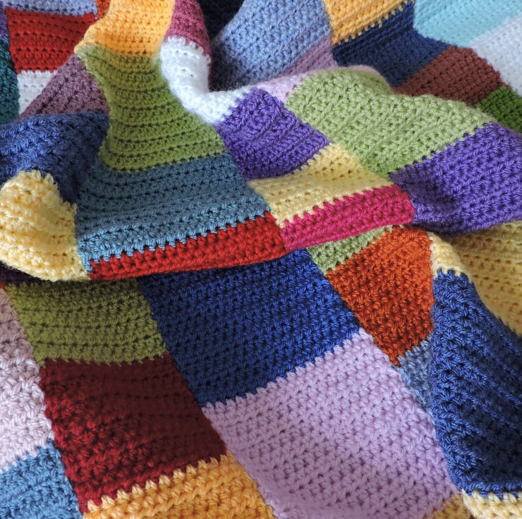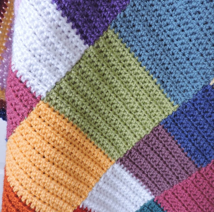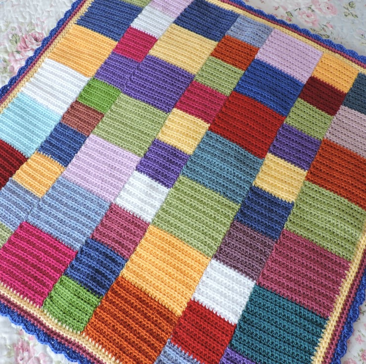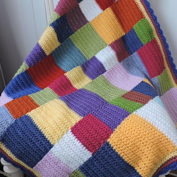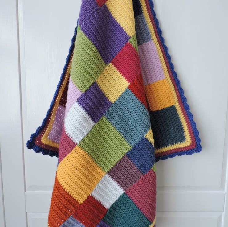 SALE was £20.00 now £12.50 . This patchwork crochet blanket has been made with 100% premium acrylic double knit yarns. Lovely bold colours of blue, pink, red, orange, yellow, green, white, mauve finishing with a royal blue wavy edge. Soft and warm, ideal as a lap blanket, a wheelchair blanket, baby blanket, picnic blanket or any other use you can think of.
