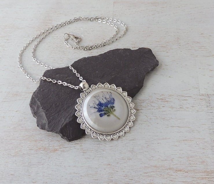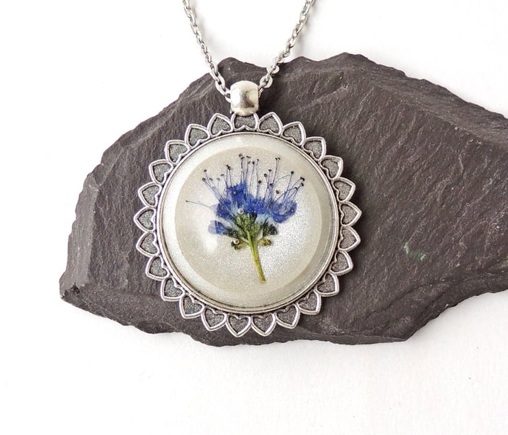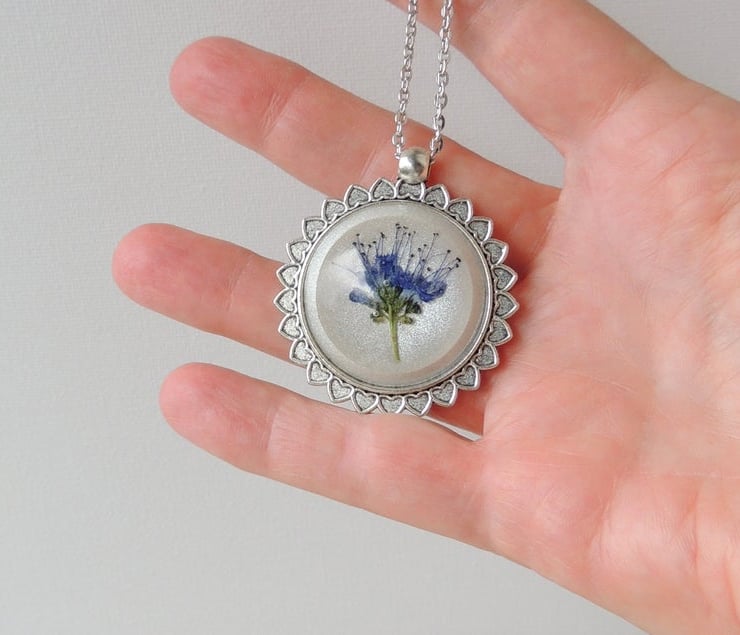 I made the cabochon with a flower from my garden that I picked and pressed to use in my resin flower jewellery. I have cast the flower in a resin cabochon finishing with a frosty white colour background. The cabochon was then set into an antique silver plated bezel and the chain added.