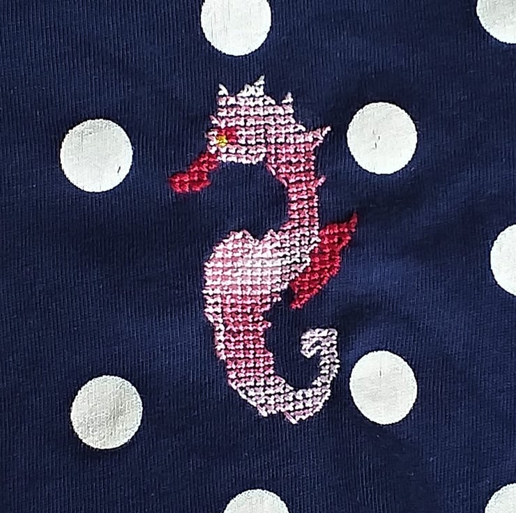 It took me a long time to decide what to embroider on this very pretty navy spotted background. It struck me that the spots looked like bubbles in a midnight sea, so what else but a fish? The pink band inside the neck suggested the colour, and the seahorse printed on the label clinched it!