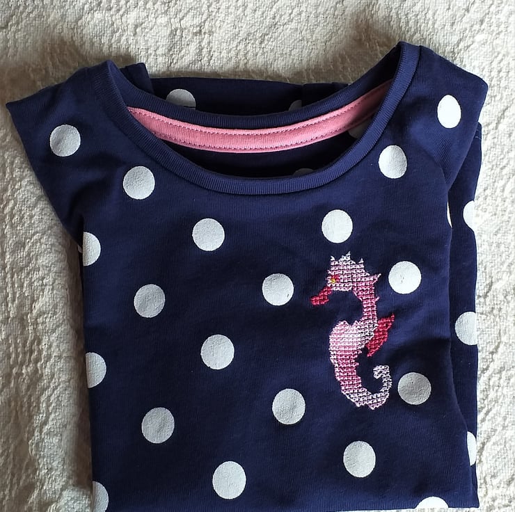 Here's an absolutely gorgeous little navy T-shirt with white spots. I have hand-embroidered a variegated pink seahorse on the left front. The shirt has short sleeves lightly gathered on the shoulder, is 100% cotton and machine washable.